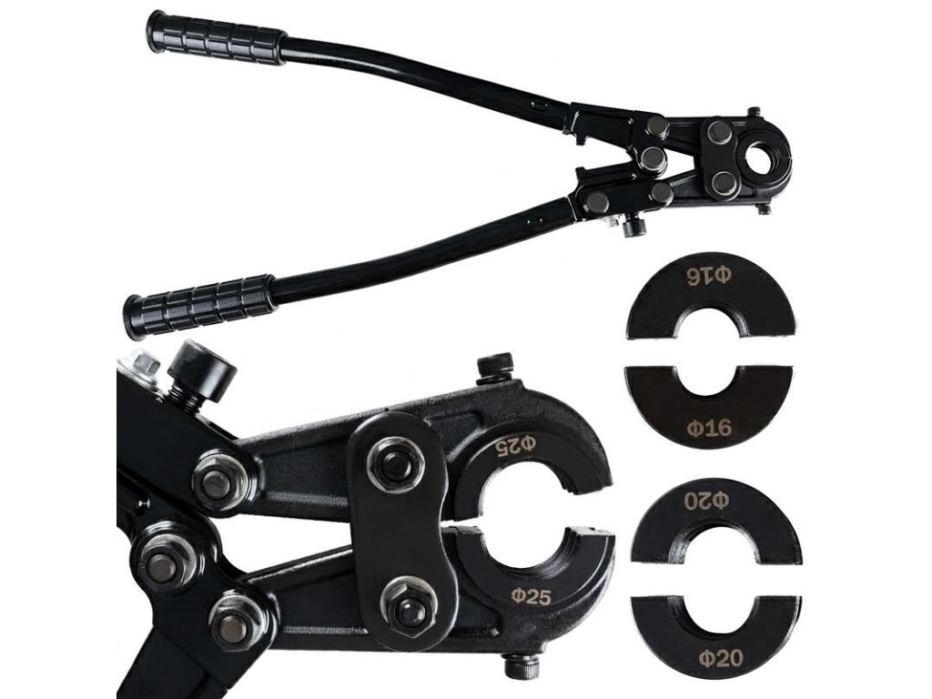 Profesionální krimpovací kleště pro vícevrstvé trubky. Vyrobeno z nejkvalitnější, odolné oceli a plastu. Specifikace: Součástí balení jsou 3 lisovací matrice: (16, 20, 25 mm), rozměry: 53x13x4 cm, ergonomické pogumované rukojeti, lisovací matrice ve tvaru U, rozměry balení: 55x14x4 cm. Produkt balen v dalším fóliovém sáčku - připraveno k odeslání.