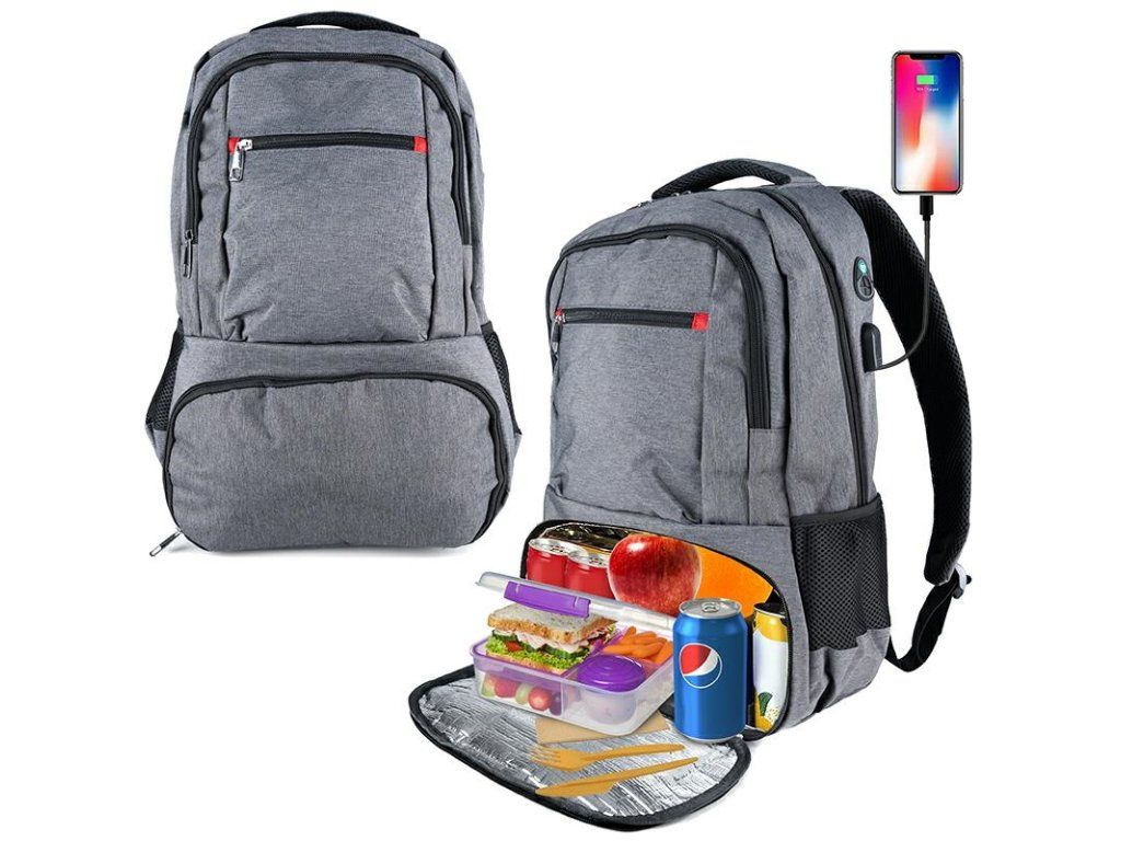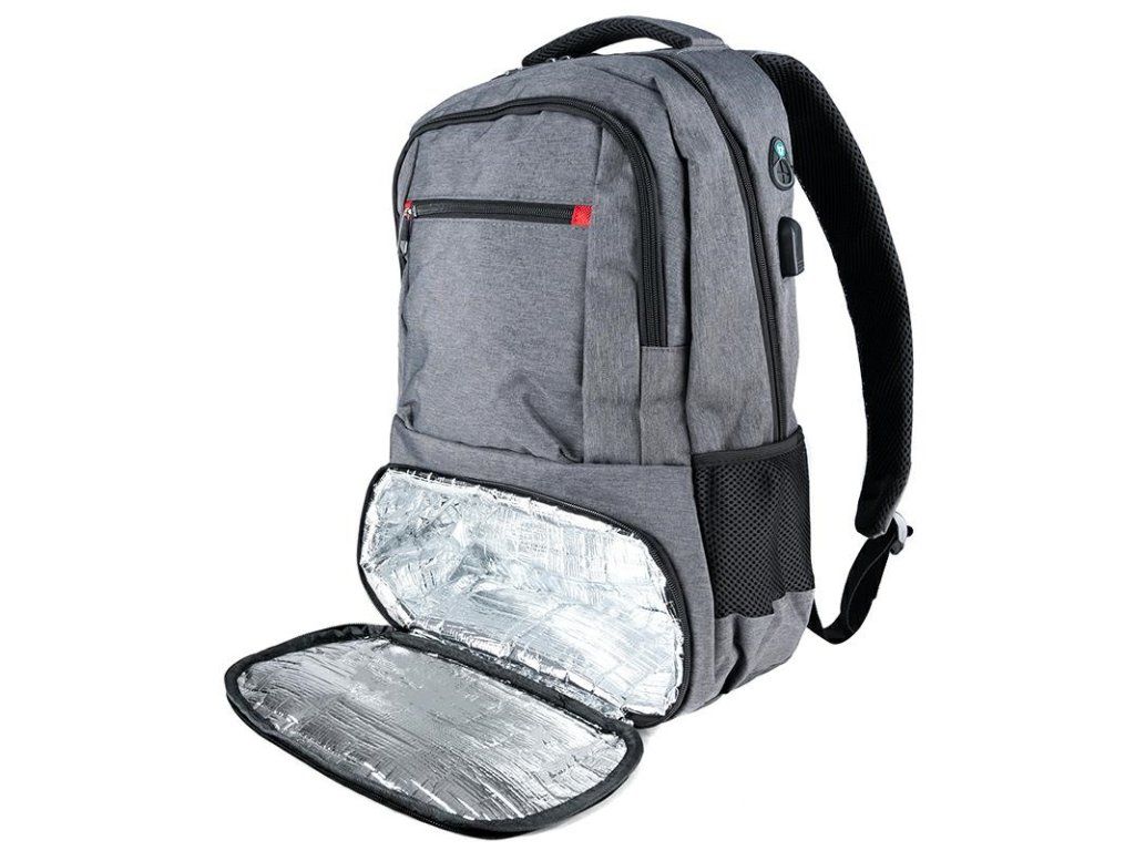 Turistický/kempingový batoh s termokapsou, vybavený USB nabíjecím portem a portem pro sluchátka. Vlastnosti: Přihrádka na notebook/netbook, odolný, voděodolný materiál, USB nabíjecí rozhraní (vyžaduje zdroj napájení), port pro sluchátka bez nutnosti rozepínání batohu, 3 hlavní přihrádky (včetně jedné termo přihrádky), 9 kapes, materiál: polyester, rozměry: 49x33x22cm, objem: cca 35l, produkt balen v dalším polyetylenovém sáčku - připraveno k odeslání. Počet kusů na paletě: 240