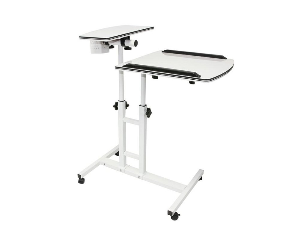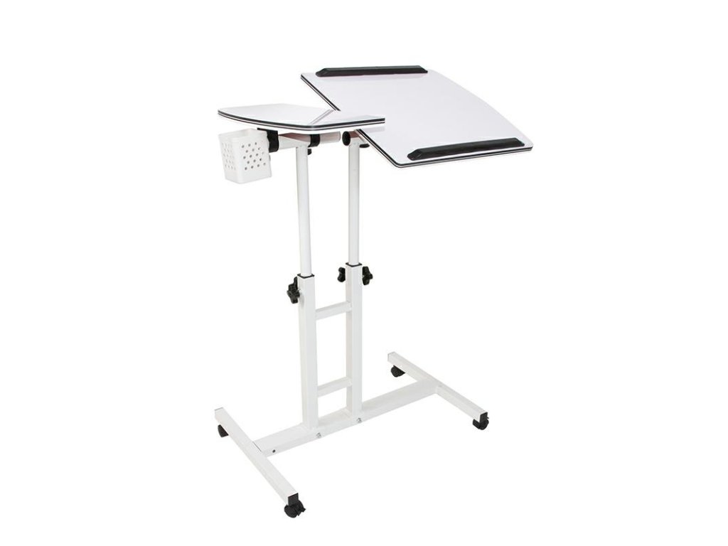Univerzální stolek na notebook na kolečkách. Má dvě nezávisle nastavitelné desky stolu s nastavitelnou výškou a polohou. Díky kompaktním rozměrům je ideální i pro ty nejmenší prostory. Kolečka mají aretační mechanismus, který zabraňuje nežádoucímu pohybu během používání. Akrylátové desky stolu. Organizér na psací potřeby zdarma. Specifikace: - barva: perleťově bílá - 2 nezávisle nastavitelné desky stolu - 4 aretační kolečka - rychlá a snadná montáž - 2 kolejnice na větší desce stolu zabraňují sklouznutí předmětů (např. notebooku) - boční desku stolu lze použít například jako stojan na myš - rozměry větší desky stolu: 44 x 40 cm - rozměry menší desky stolu: 40 x 20 cm - nastavitelná výška: 60-90 cm - další organizér na psací potřeby - sada pro svépomocnou montáž - šroubovák je součástí balení. Rozměry balení: 66x48x11,5 cm. Počet kusů na paletě: 50