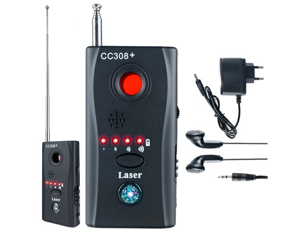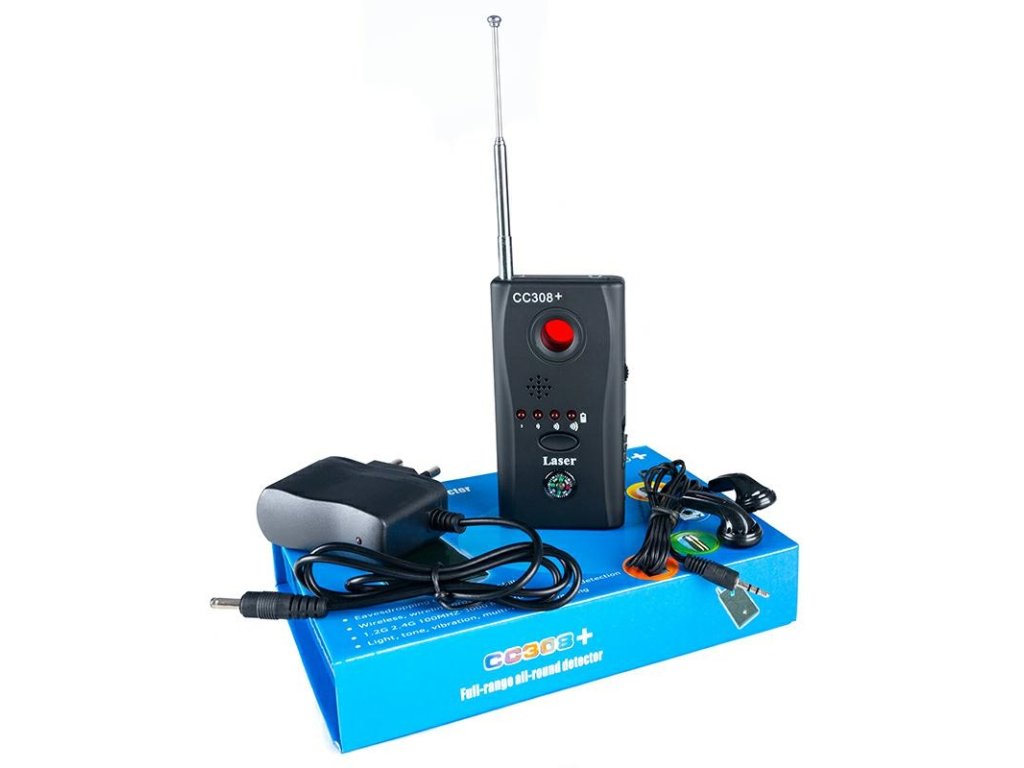 Detektor kamer, odposlechů a dalších špionážních zařízení model CC308+ Vlastnosti produktu: - široký rozsah testovaných frekvencí 1-6,5 GHz - optická indikace síly signálu pomocí 4 LED diod - zvuková indikace - výsuvná anténa - eliminace falešného rušení - diskrétní provoz (nevydává žádné zvuky) - výkon detekovaných objektů: 50mW-200mW (dosah detekce 30-50cm) - výkon detekovaných objektů: 300mW-600mW (dosah detekce 100-200cm) - výkon detekovaných objektů: 800mW-1200mW (dosah detekce 300-1000cm) - vestavěná lithiová baterie 110mAh - laserová sonda - speciální pozorovací filtr - odolné plastové pouzdro - napájení: AC 110-230V 50/60Hz - vstup pro sluchátka - sluchátka součástí balení - kompas - napájen vestavěnou baterií (nabíječka součástí balení) - Barva: Černá - Miniaturní Rozměry: 93x47x15 cm