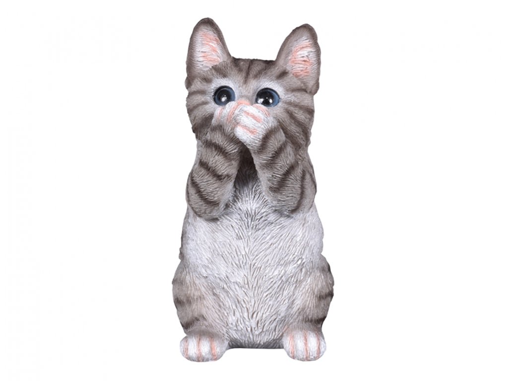 Zahradní dekorace v podobě kočky zakrývající si tlamičku ve stylu nemluvím. Je vyrobena z polyresinu, který figurce dodává pevnost a také odolnost vůči povětrnostním vlivům. Rozměry: délka 16 cm, výška 18 cm, hloubka 11 cm. Barva: mourovatá.