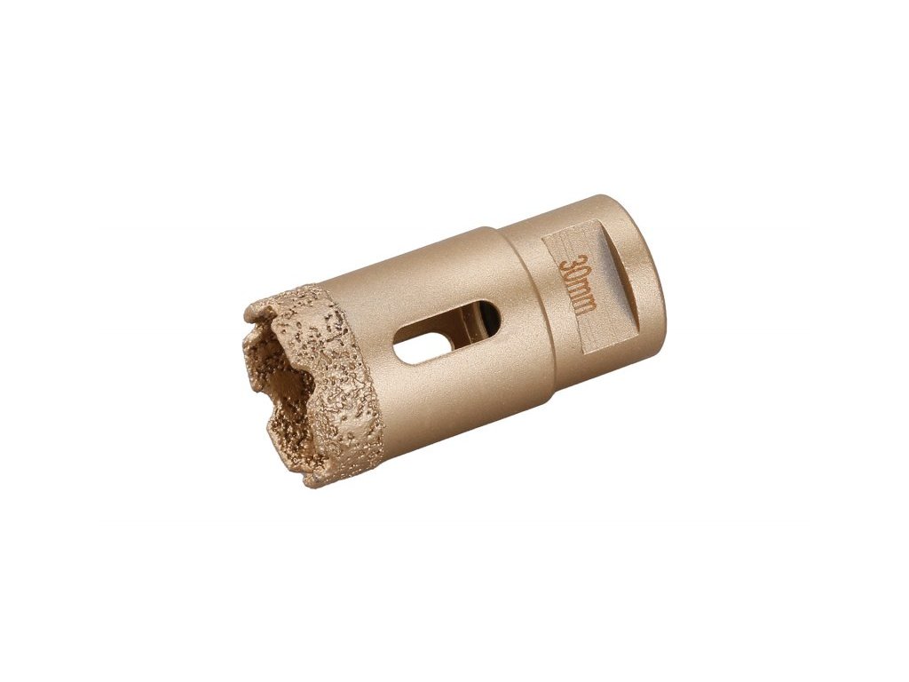 profesionální vykružovací diamantová korunka se závitem M14 - pro úhlové brusky pro "suché" přesné a rychlé vrtání do kamene, dlažby, obkladů, žuly, mramoru a jiných extrémně tvrdých materiálů nejen ve stavebnictví výška vrstvy diamantu 10 mm, dlouhá životnost bez nutnosti použít jakýkoli pomocný nástroj vykroužíte přesný otvor na požadovaném místě doporučený pracovní postup - našroubujte korunku přímo na závit hlavy úhlové brusky, pevně dotáhněte, vykružovat požadovaný otvor začněte pod úhlem 45 °, korunka a rychlost brusky okamžitě zajistí uchycení v požadovaném místě, pomalu při rovnoměrně vytvořeném tlaku narovnejte směr vykružování do svislé polohy, menší průměry 6 - 14 cm je u vrtání do tvrdých dlažeb, mezi jednotlivými vrty, ZCHLADIT - stačí ponořit do sklenice s vodou nebo nechat v otáčkách ochladit vzduchem! Instruktážní video