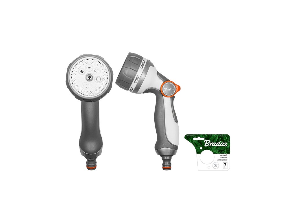 Kovová 7funkční nastavitelná zavlažovací pistole BRADAS White Line SMOOTH CONTROL s regulací průtoku vody, patentovaným spínačem a regulací přítoku a odtoku vody je nezbytným pomocníkem při práci na zahradě.