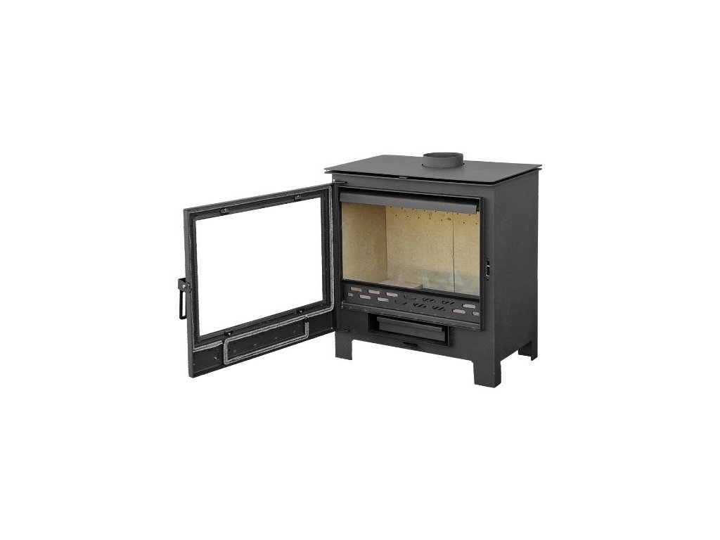Tělo kamen z ocelového plechu s velkým proskleným oknem je ošetřeno černou žáruvzdornou barvou.