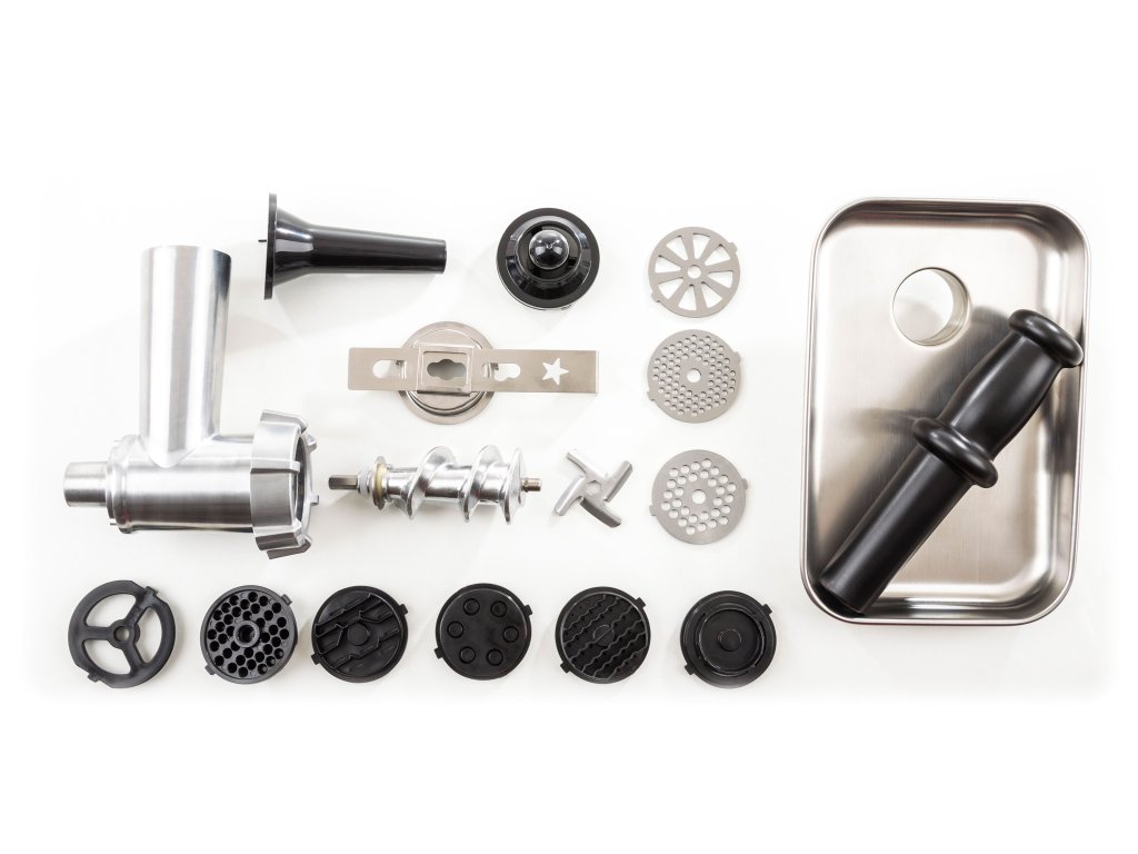 - Mlýnek na maso obsahuje 3 velikosti mlecích destiček pro různou hrubost masa. Příprava sekané, karbanátků nebo třeba výborného tatarského bifteku je pro něj hračkou a pro vás radostí.