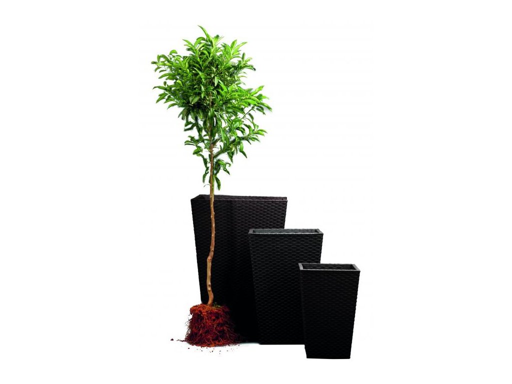 Květináč vhodný do exteriéru i interiéru, kvalitní plastová konstrukce s dlouhou životností, stálobarevný a odolný vůči UV záření. Design ve stylu přírodního ratanu, grafitová barva, rozměry 38,5 x 57 x 38,5 cm.
