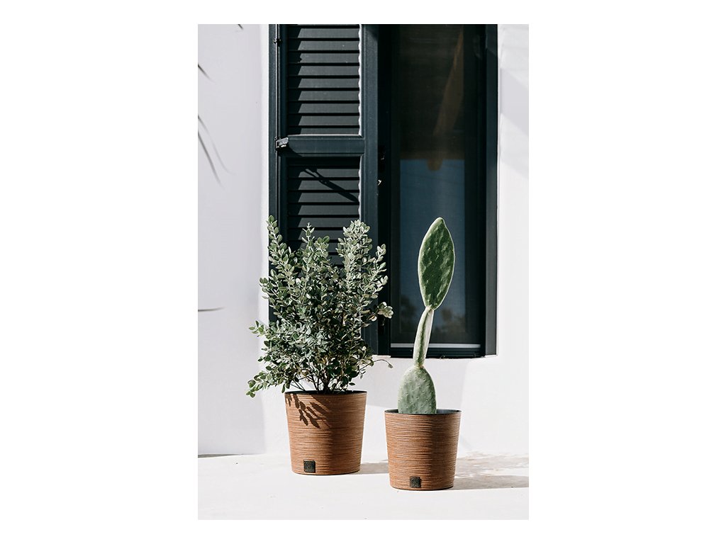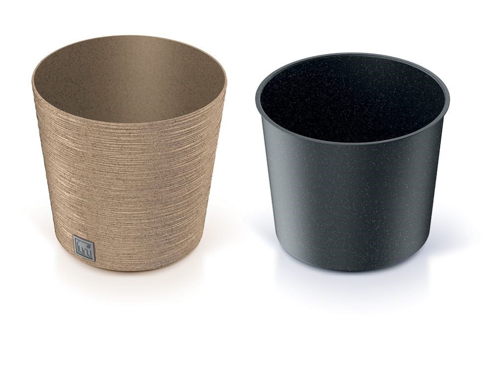 Květináč do venkovního i vnitřního prostředí, objem květináče 9 l, objem vložky 7,5 l, vyrábí se z plastu a ze dřeva (až 33 %), rozměry 25 x 22,4 x 25 cm, barva hnědá.