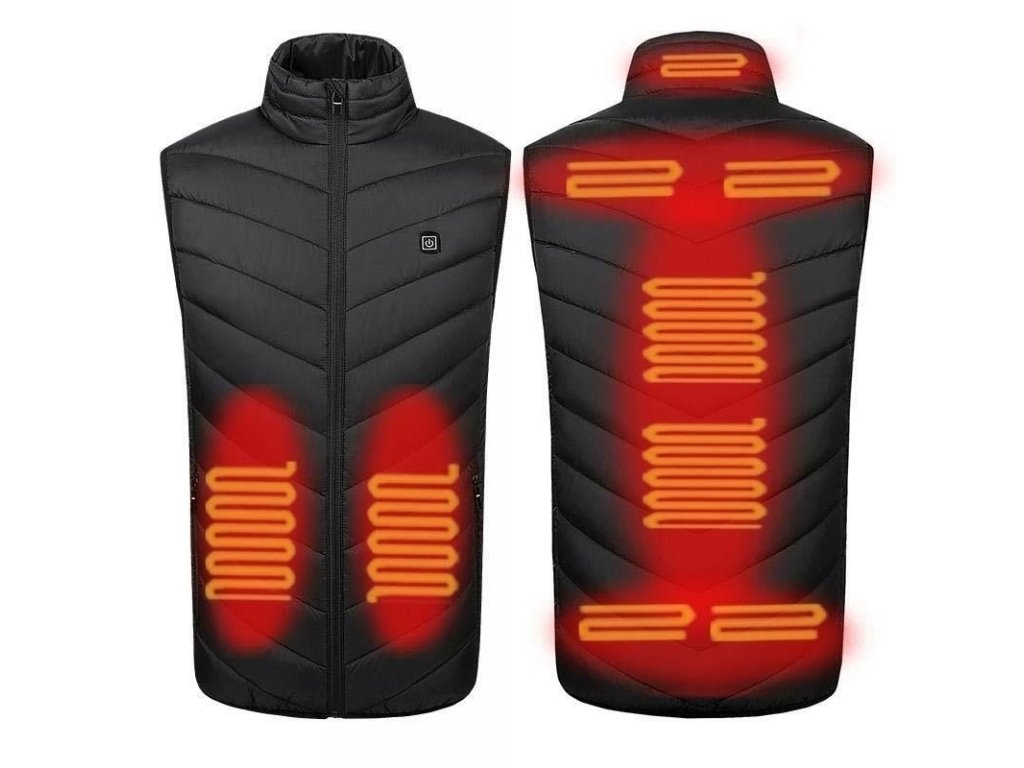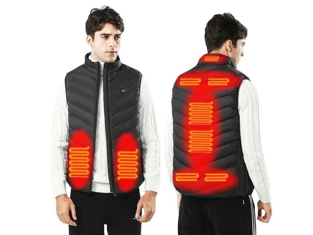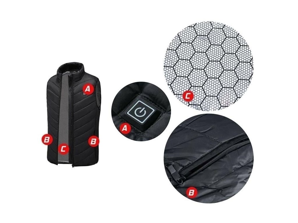 Vyhřívaná vesta/bez rukávů, napájení přes USB. Vesta je jako stvořená pro chladné dny - stačí připojit externí zdroj energie - např. powerbanka. Specifikace: materiál: 100% polyester velikost: XL (šířka hrudníku 60cm, délka: 72cm) napájení: USB 5V 2,1A (bez zdroje - pro provoz vyžaduje např. připojení powerbanky) speciální kapsa pro uložení powerbanky (rozměry 16x16cm) spínač na hrudi 3 stupně ohřevu (max. 5 stupňů Celsia tepl.
