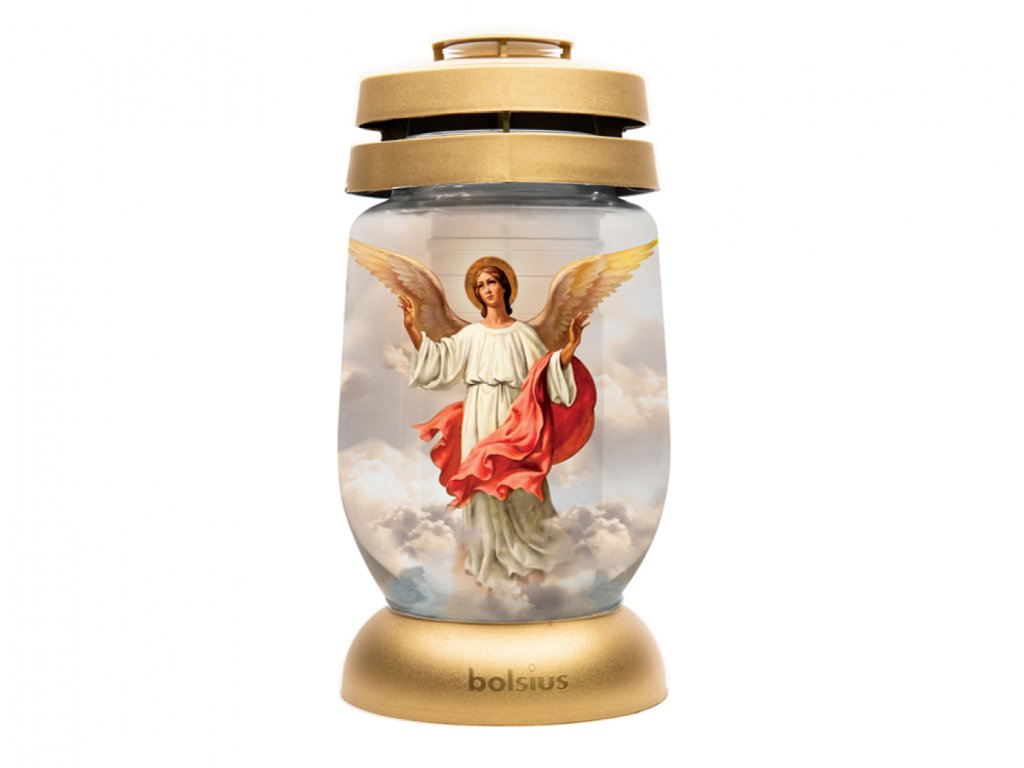 Hřbitovní lampa s obrázkem anděla, s víčkem a podstavcem ve zlaté barvě. Tradiční kresba a moderní provedení lampy vytváří harmonický celek, který vkusně ozdobí pietní místa. Materiál: sklo, plast. Odolné proti vodě a UV záření. Hmotnost náplně: 110 g. Doba hoření: 36 hodin. Rozměr: průměr 11 cm, výška: 22 cm. Barva: zlatá. Vhodná náhradní náplň: 92068bí (40 h), 92071bí (50 h), 92074bí (75 h), 92075bí (100h).