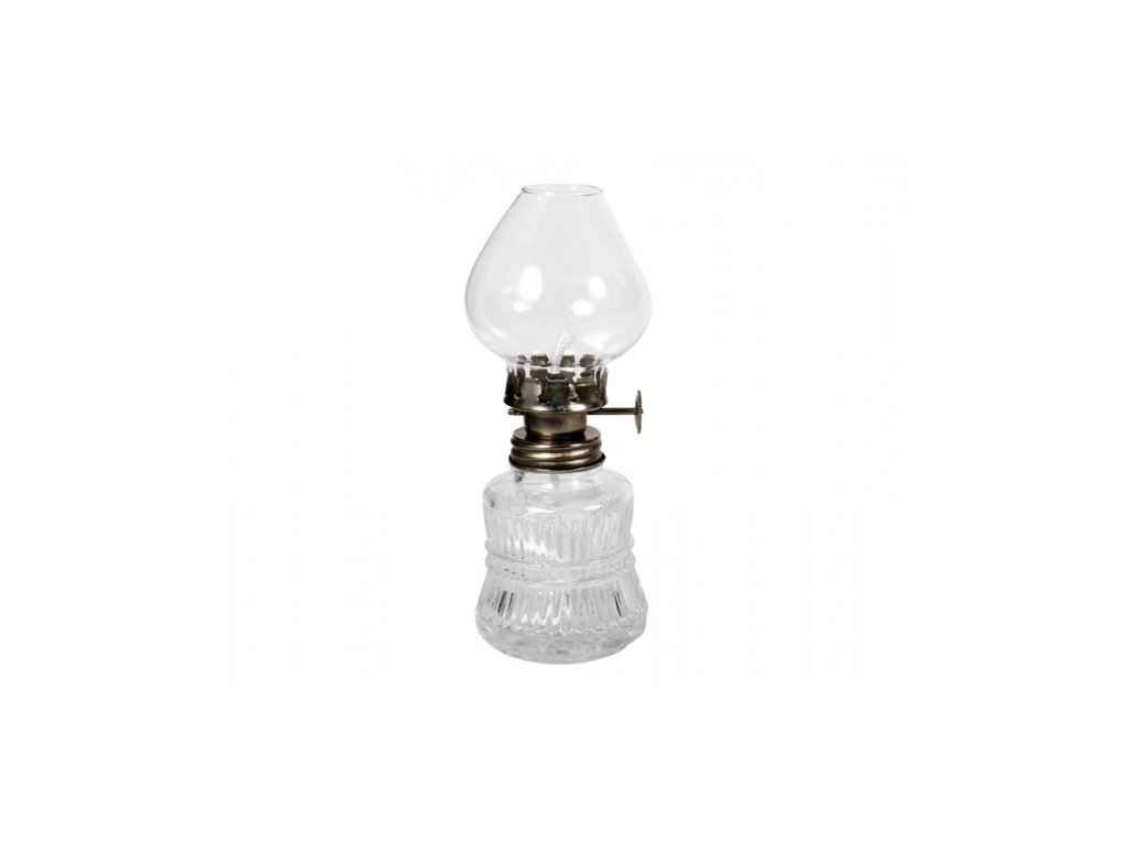 Petrolejová lampa se skleněným cylindrem. Cylindr zajišťuje optimální hoření a stabilitu plamene. Výška: 14 cm. Objem bazénky: 60 ml.