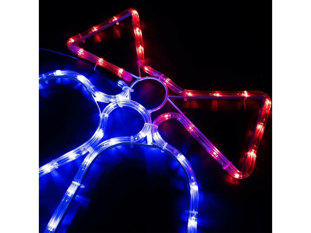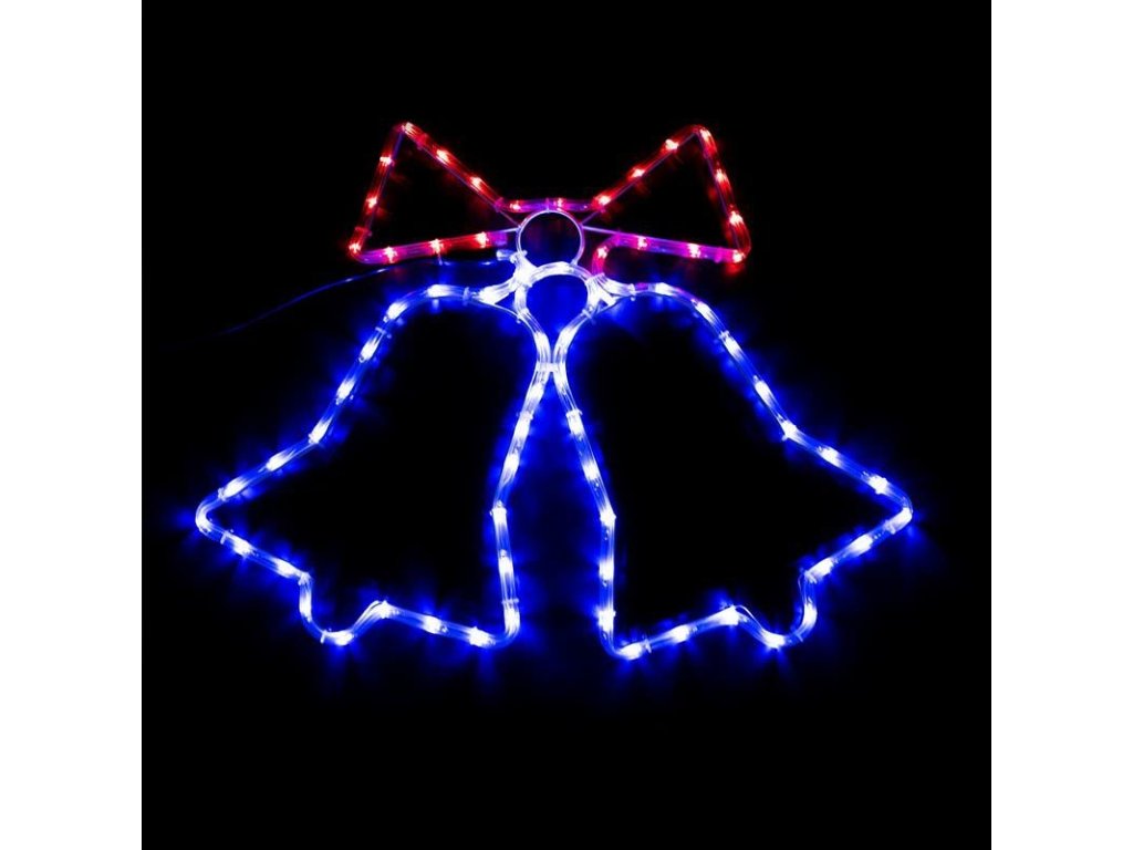 LED světelný řetěz ve tvaru zvonu s mašlí. Polovodičový světelný zdroj je velmi odolný a nevyzařuje teplo. Spotřeba energie je do 10 % standardní žárovky při zachování stejné intenzity světelného toku. Specifikace: Napájení: 220-240V, pevný kovový rám, barva světla: modrá + červená, krytí IP: IP44, rozměry: 60x48cm, počet LED diod: 72, délka napájecího kabelu: cca 140cm, délka řetězu: 3m, rozměry krabice: 62x51x5cm, množství na paletě: 70 ks