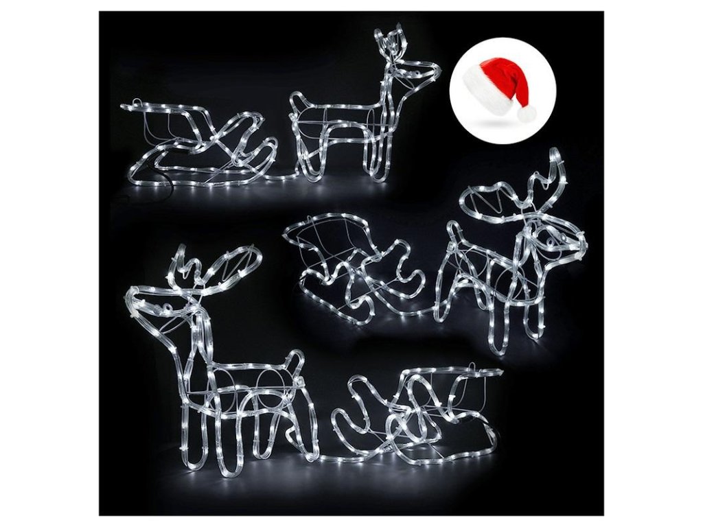LED řetěz ve tvaru soba se saněmi. Polovodičový světelný zdroj je velmi odolný a nevyzařuje teplo. Spotřeba energie je do 10 % běžné žárovky při zachování stejné intenzity světelného toku. Třída voděodolnosti: IP44 Programátor - 8 režimů svícení Barva světla: studená bílá Celková délka sady: cca 120 cm Rozměry: 120x22x48 cm Napájení: 220-240V Délka LED kabelu: 8 m Počet LED diod: 160 ks Délka napájecího kabelu: cca 150 cm Rozměry krabice: 47x38x25 cm ZDARMA čepice Santa Clause množství na paletě: 40 ks