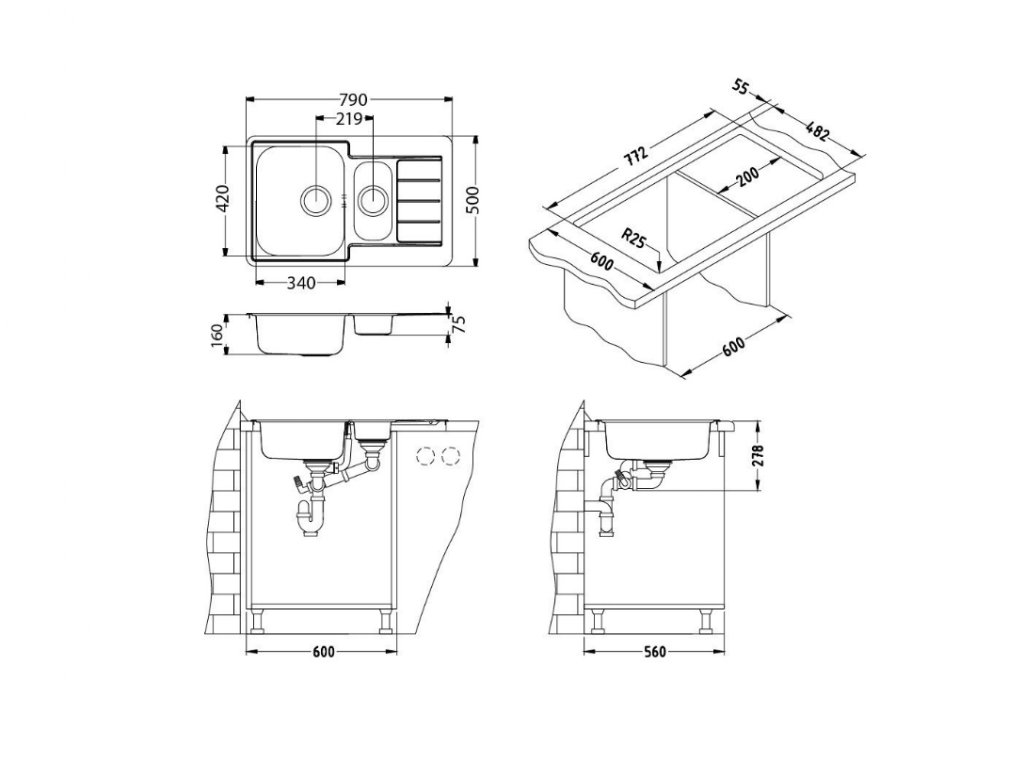 Rozměry: 790 x 500 mm, vaničky: 340 x 420 x 160 mm / 148 x 300 x 75 mm, pro skříňku: od 600 mm, výpusť: 92 mm, příslušenství: sifon s odbočkou na myčku, sítko 3 1/2", montážní příslušenství.