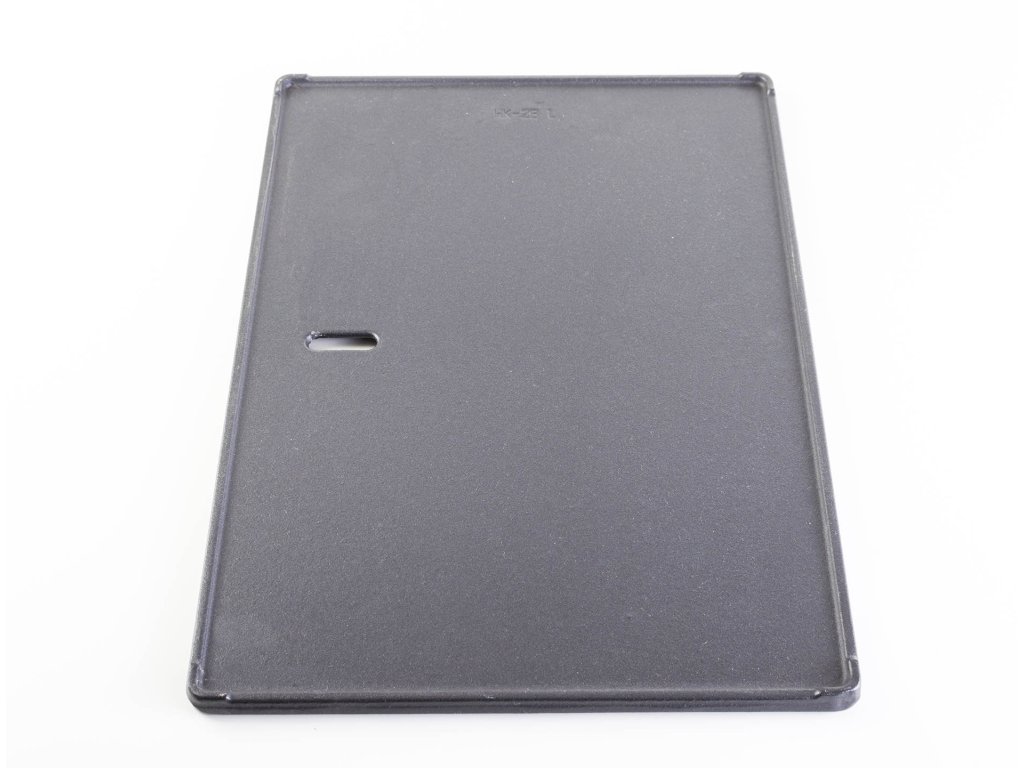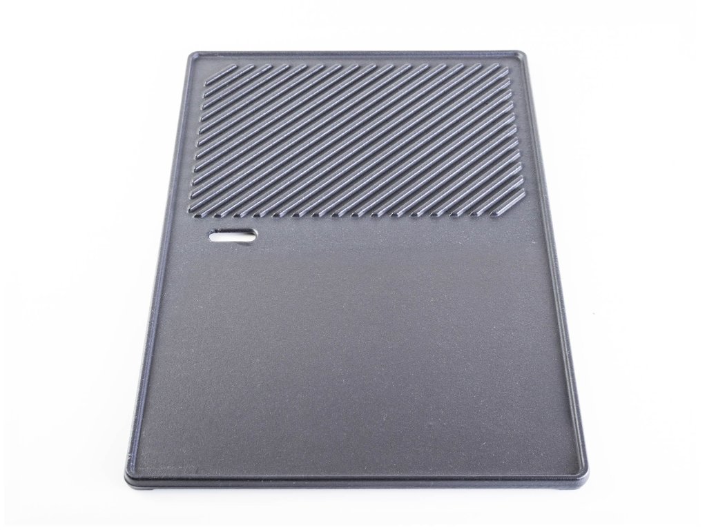 Litina patří mezi nejodolnější materiály, které se pro grilování používají. Je vysoce odolná proti vysokým teplotám a poškrábání. Na každé polovině litinového plátu máte k dispozici jiný druh povrchu. Jedna polovina je hladká a využijete ji především pro grilování nakrájené zeleniny, vajíček a sýrů. Druhá polovina s vroubky je určena pro správné grilování steaků, větších kusů zeleniny a ryb.