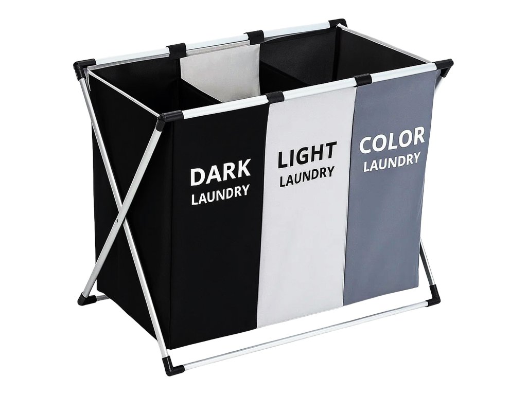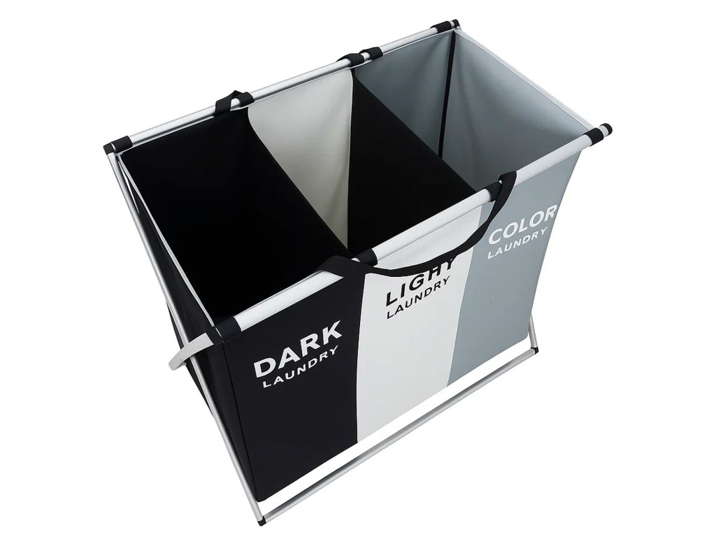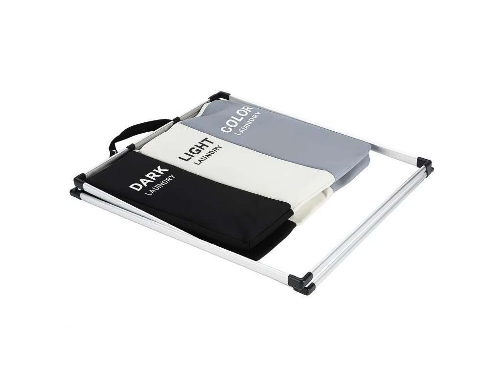 Tento tříkomorový koš na prádlo je perfektním řešením pro rychlé třídění oblečení na tmavé, světlé a barevné kousky. Je vyroben z odolného materiálu a podepřen stabilním skládacím rámem, takže díky svým kompaktním rozměrům je perfektním doplňkem do každé koupelny, prádelny nebo šatny. Kombinace funkčnosti a estetiky – zjednodušuje každodenní organizaci domácích prací. Rozměry: 65 x 40 x 60 cm