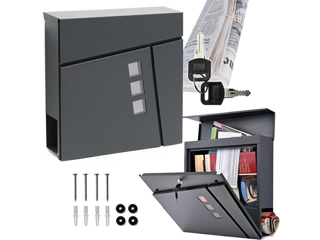 Tato poštovní schránka je vyrobena z práškově lakované pozinkované oceli. Tento odolný materiál je odolný vůči drsným povětrnostním podmínkám. Specifikace: Materiál: 0,6 mm silná, práškově lakovaná pozinkovaná ocel. Velký vkládací otvor: 33,5x3,5 cm. Vnější rozměry: 37x36,5x11 cm. Součástí balení jsou dva klíče a montážní šrouby. Držák na noviny. Rozměry balení: 40x40x13,5 cm. Množství na paletě: 70 kusů.