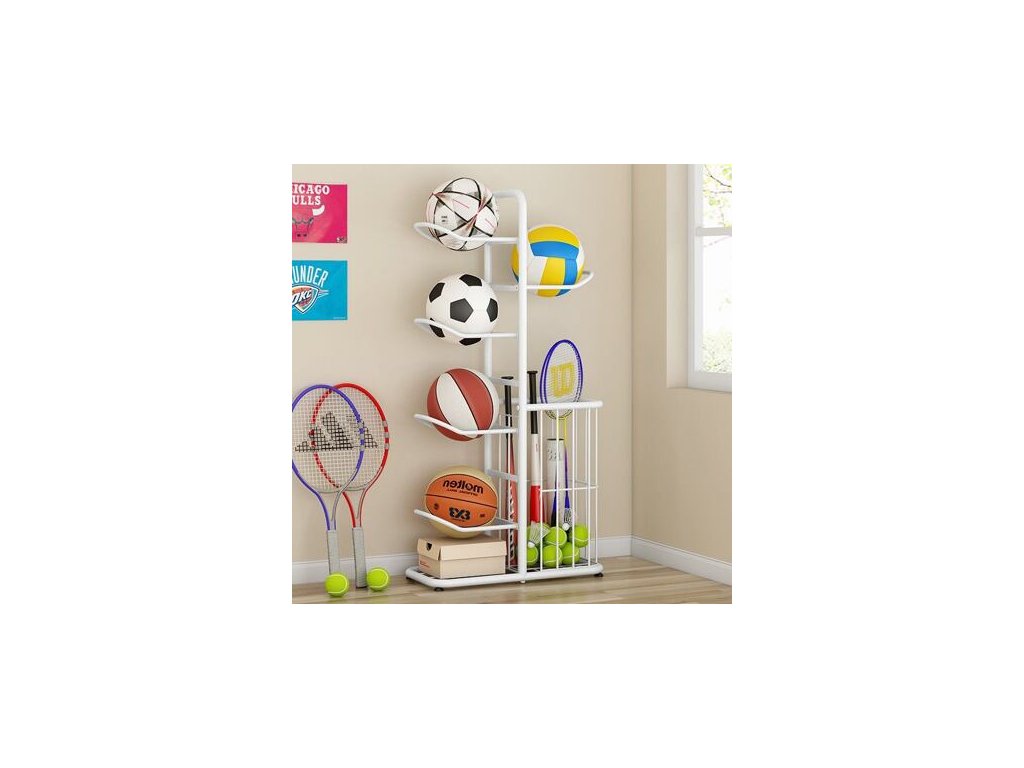 Středně velký stojan pro sportovní vybavení a hračky. Praktická pomůcka do domácnosti a pro sportovní kluby.
