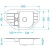 Vestavěný dřez, univerzál. Provedení : granitový dřez s odkapem Vnější rozměr: 900 x 500 mm Rozměr vaničky: 344x430x160 mm 100x295x70 mm Exentický sítkový ventil 3 1/2 s přepadem, sifon pro úsporu místa s odbočkou na myčku Úchyty a těsnění pro upevnění dřezu v balení S otvorem pro baterii Návod pro instalaci v obrázcích na obale Instalace do skříňky o šířce 600 mm, roh 900 mm