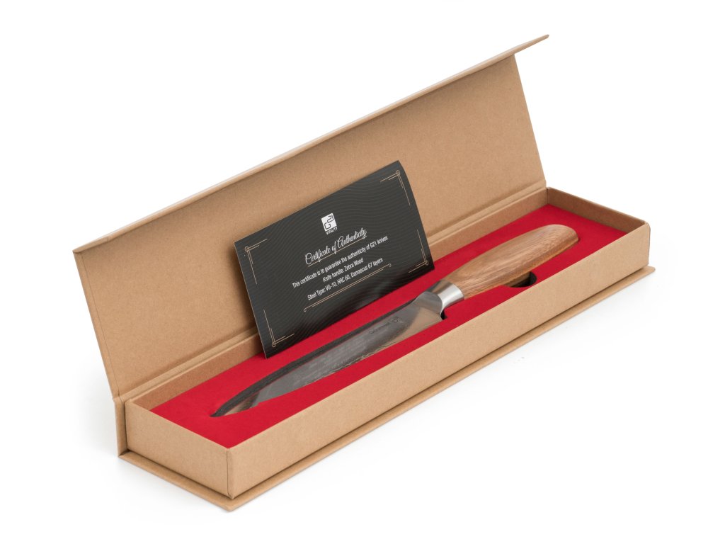 Čepel nože G21 Gourmet Damascus je vyrobena z kvalitní 67vrstvé damaškové oceli VG-10, která je velice odolná, má vysokou stabilitu a neuvěřitelně dlouhou životnost ostří. Vrstvená damascénská ocel se používala i k výrobě zbraní nebo mečů pro svou vysokou tvrdost a stálost. Damašková ocel je složena ze dvou či více různých ocelí, které jsou spojeny v jeden celek. Výsledkem je materiál odolný proti opotřebení a zároveň proti přelomení. Díky použitému materiálu je čepel nože G21 Gourmet Damascus ostrá, odolná, pevná a při správné péči vám bude sloužit i desítky let.