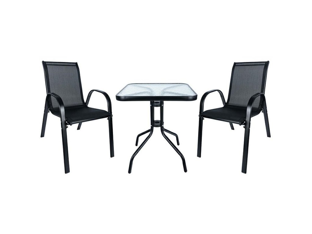 Tato sada zahradního nábytku obsahuje dvě židle a stůl. Tyto odolné židle s moderním designem dodají každé terase, zahradě nebo balkonu nádech elegance. Vlastnosti produktu: Materiál: ocel, sklo a polyratan (PVC podložky) Rozměry židle: (Š x H x V): 51,5 cm x 68 cm x 84 cm Rozměry stolu (D x Š x V): 60 x 60 x 65 cm Maximální nosnost židle: 120 kg Maximální nosnost stolu: 50 kg Sada obsahuje: stůl se skleněnou deskou, 2 židle, rozměry balení: 77 x 70 x 13 cm Počet kusů na paletě: 23