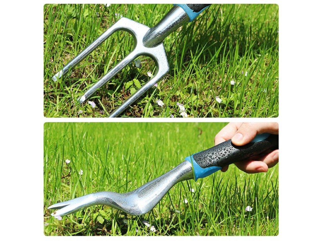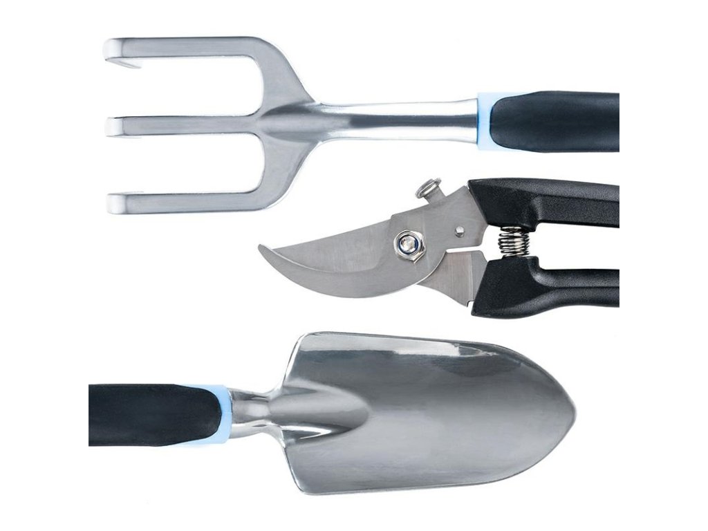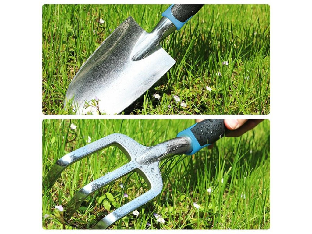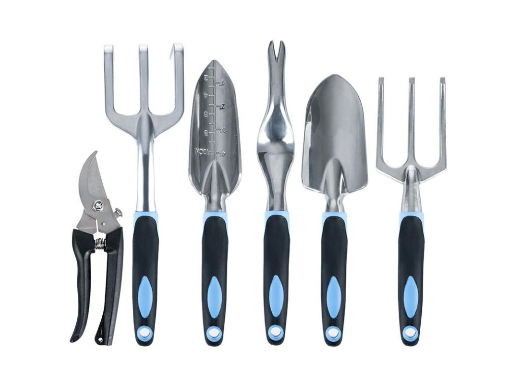 Sada zahradního nářadí vyrobená z odolné kovové slitiny. Nářadí má pohodlné rukojeti s gumovou úpravou. Sada obsahuje: úzkou lopatu s krejčovským metrem do 10 cm (celková délka: 30 cm, šířka čepele: 5,5 cm), širokou lopatu (celková délka: 30 cm, šířka čepele: 7 cm), vytrhávač plevele (celková délka: 30 cm, šířka: 4 cm), hrábě (celková délka: 30 cm, šířka: 7,5 cm), kultivátor (celková délka: 28 cm, šířka: 7,5 cm), prořezávače větví (délka: 17 cm, šířka: 4,5 cm, délka zahnuté čepele: 5 cm). Produkt je balen v dalším fóliovém sáčku - připraveno k odeslání. Množství na paletě: 450 ks