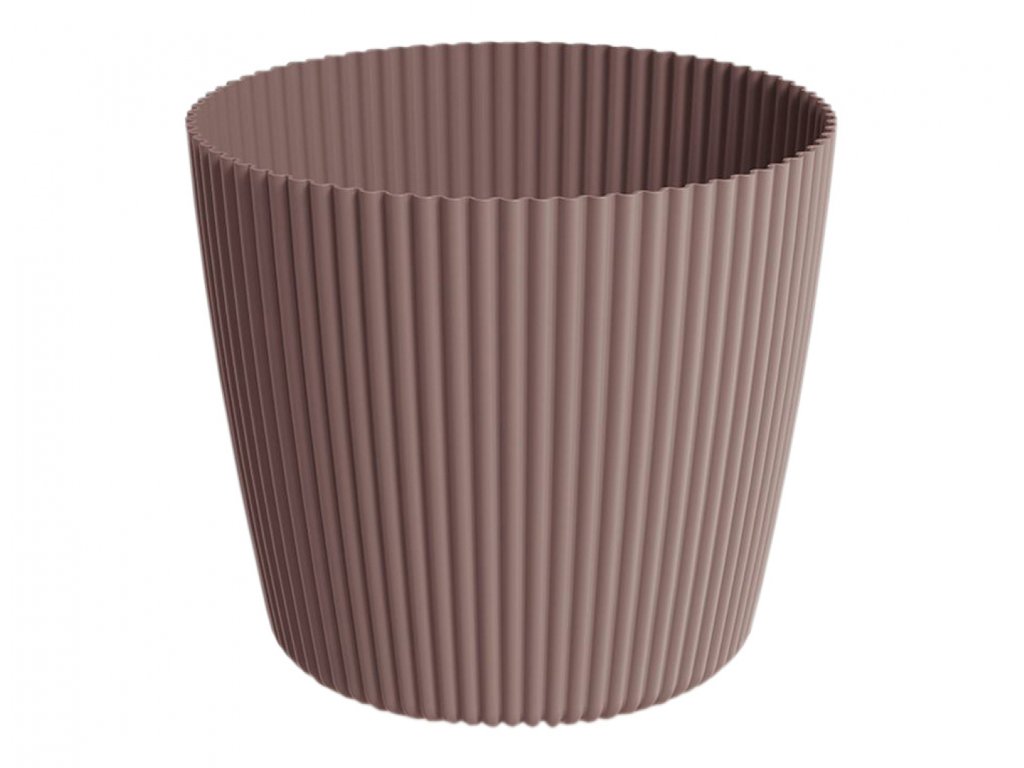 Plastový, matný obal na květník. Jeho tvar půdorysu vypadá jako vykrojený, což na obvodu vytváří zaoblené proužky, a tvoří prostorový efekt. Jeho design je jednoduchý a přesto upoutá pozornost. Rozměry: průměr 20 cm, výška 17 cm. Objem: 4 l. Barva: červeno-hnědá.