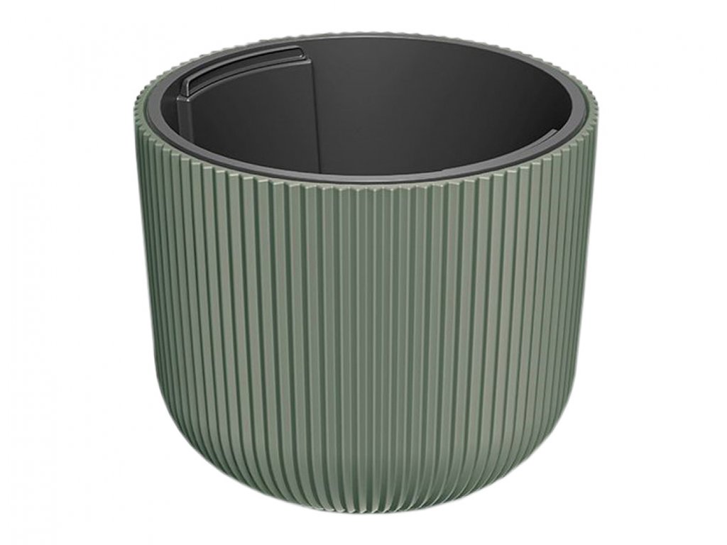 Plastový, matný, samozavlažovací obal na květník. Obsahuje vyjímatelnou vložku, do které se nasune dno a měrka. Do vyjímatelné vložky přijde dno s nasazenou měrkou, a následně rostlina v substrátu. Pak může dno oddělovat zásobu vody od rostliny a ta si ji může vzít, když jí potřebuje. Měrka pomůže dolívat vždy správné množství vody. Obal je nejen funkční, ale také estetický. Jeho tvar půdorysu vypadá jako vykrojený, což na obvodu vytváří zaoblené proužky, a tvoří prostorový efekt. Jeho design je jednoduchý a přesto upoutá pozornost. Zaobleného tvaru, kulatého půdorysu. Rozměry: průměr 30 cm, výška 26 cm. Objem obalu: 14 l, objem vyjímatelné vložky: 10 l. Barva: zelená.