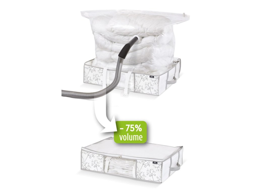 Úložný box s vakuovým sáčkem uvnitř je skvělá vychytávka pro velké úklidy i pro trochu plnější skříně. Lůžkoviny pro návštěvy nebo také sezonní oděvy, které zabírají mnoho místa ve skříni snadno naskládáte do pytle, z něhož vysavačem vysajete všechen vzduch a zavřete ventil. Obsah se tak zmenší o 75%! Box má praktické vrchní uzavírání pomocí zipů. Manipulaci s ním usnadňují postranní ucha.