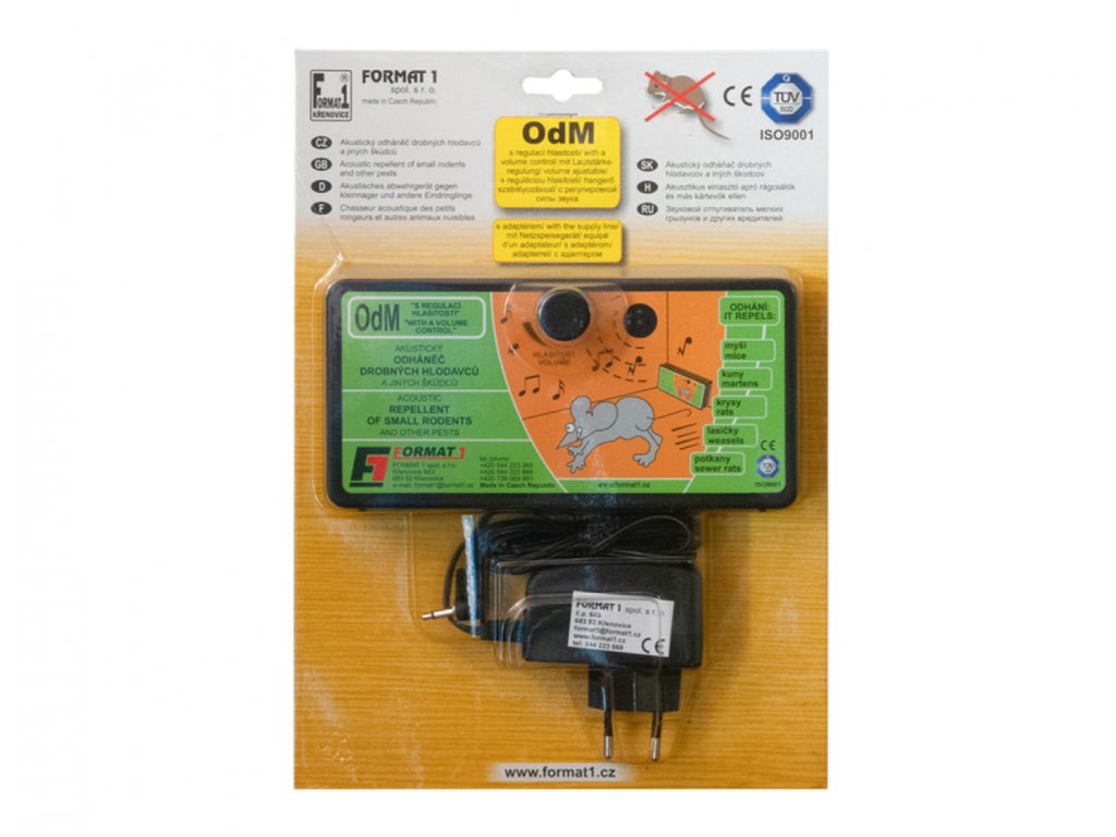 Elektrický odháněč hlodavců s regulací hlasitosti. Odhání myši, kuny, potkany, krysy, lasičky, tchoře aj. škůdce. Přístroj vydává trvalý, slyšitelný tón. Hlasitost lze regulovat. Je vhodný do jakýchkoliv prostor, v době, kdy se v chráněném prostoru pohybují lidé je možné snížit hladinu vydávaného zvuku tak, že není slyšet. Vhodný např. na chaty. Nevyužívá chemických přísad, neškodí zvířatům. Napájení bateriemi, které jsou součástí balení. Účinná plocha 100m2. Rozměry: šířka 185 mm, výška: 88 mm, hloubka: 31 mm. Hmotnost bez adaptéru: 150g.