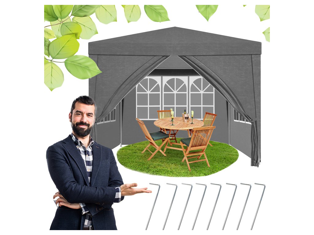 Zahradní party stan / altán 3 × 3 m se 4 bočními stěnami – šedý, voděodolný PE (PA10)