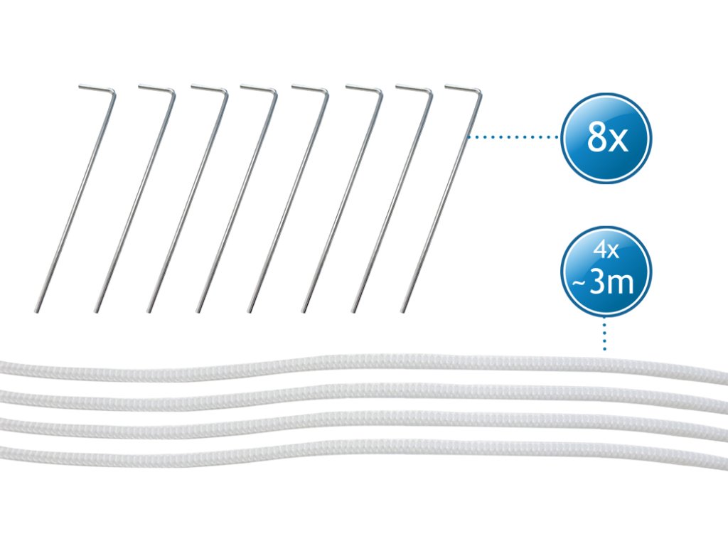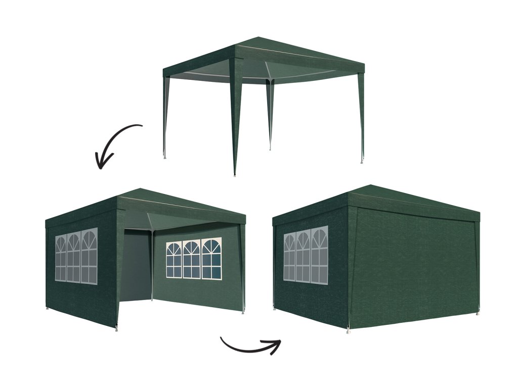| Obsah balení: | střešní plachta, 4 boční stěny (2× s okny), ocelová konstrukce, upevňovací sada (lana + kotvy), montážní návod |