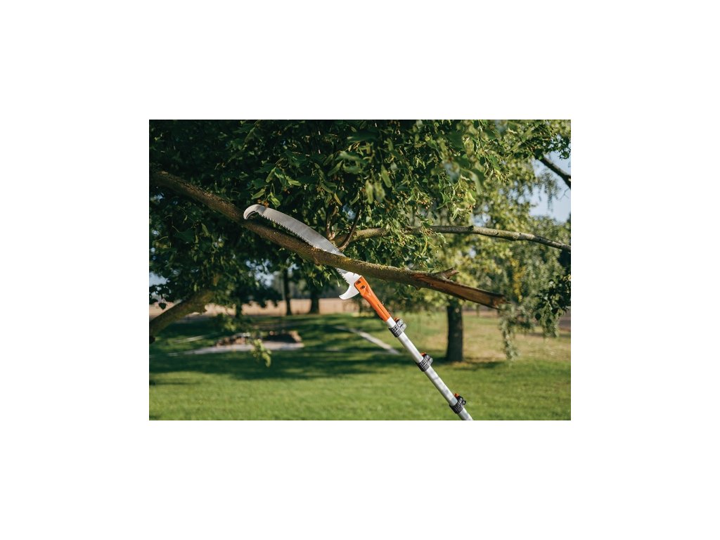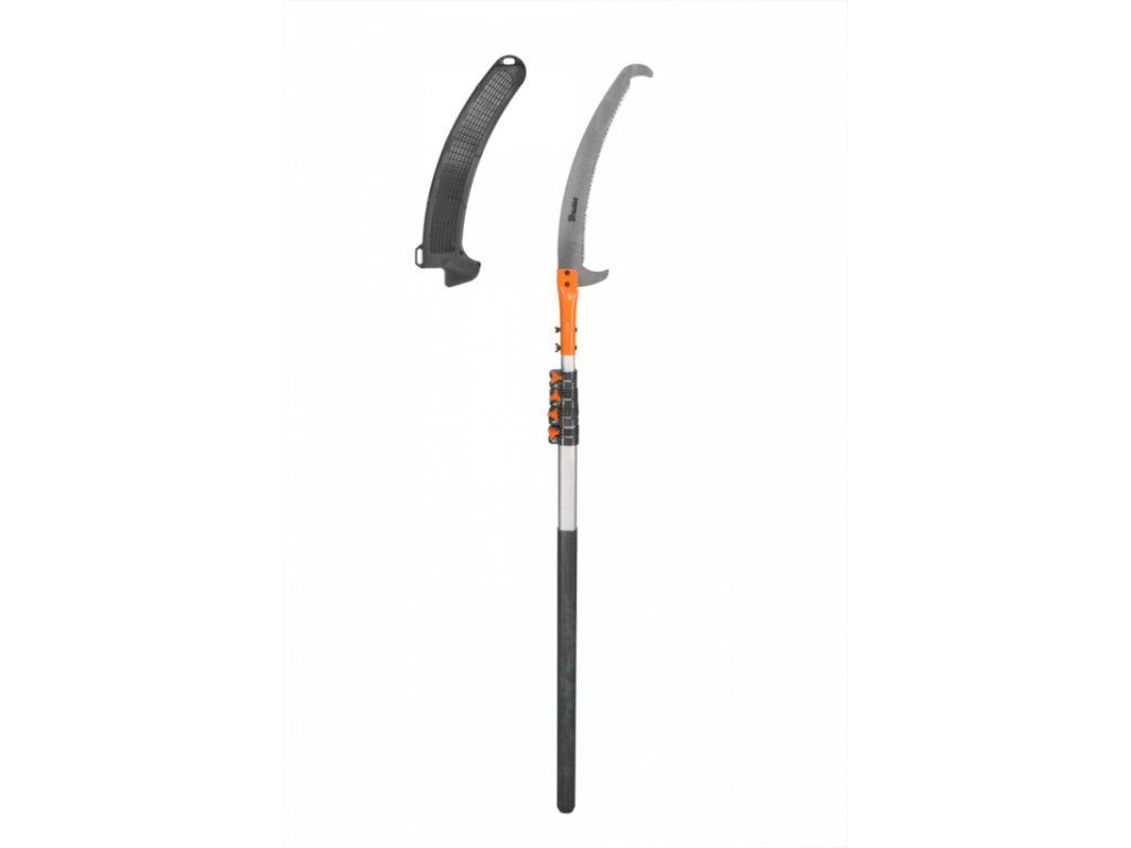 Pila Bradas V-SERIES z vysoce kvalitní kalené oceli a teleskopickou hliníkovou rukojetí s nastavitelnou délkou 135-300 cm. Hák na čepeli zajišťuje přesný řez a zabraňuje sklouznutí nástroje během práce.