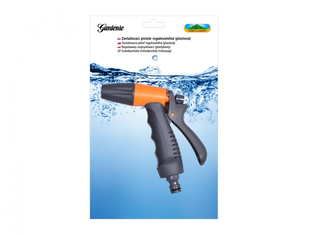 Plastová regulovatelná pistole na zahradní hadici.