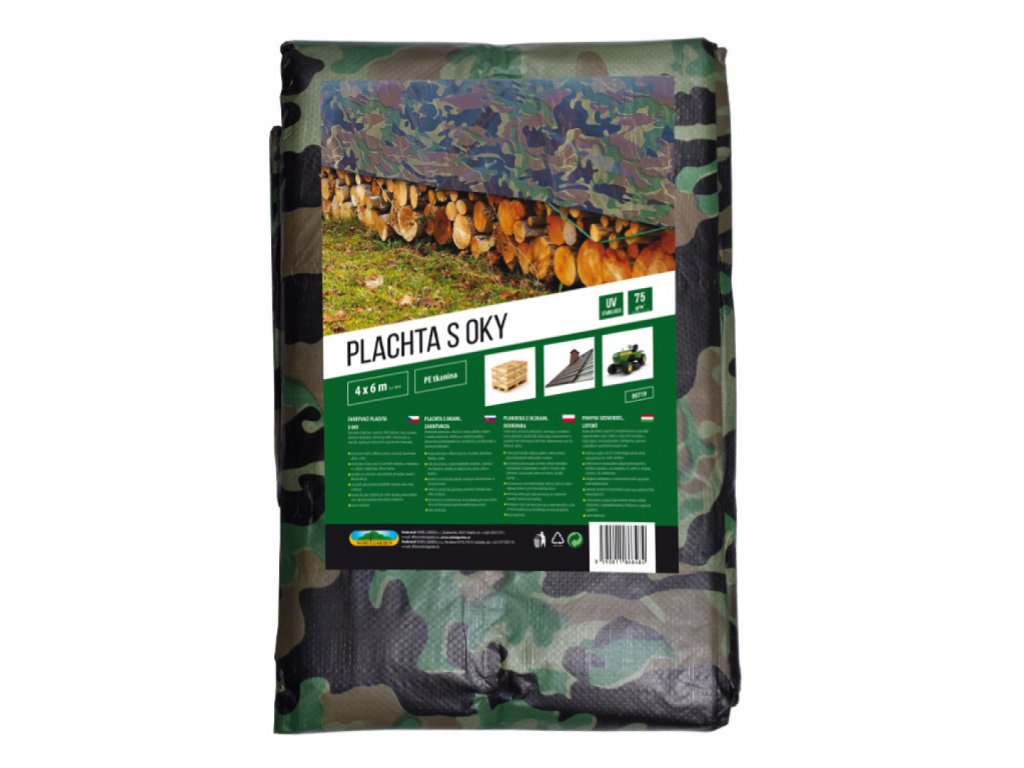 Plachta maskovací, k univerzálnímu použití. Materiál: HDPE + LDPE. Zakrývá, izoluje a stíní. Chrání proti vodě a vlhkosti, prachu, mastnotě, slunečnímu záření a větru. Pro celoroční použití v domácnosti, na zahradě, stavbě a při rekreačních a sportovních činnostech. Má kovová oka pro lepší uchycení, která jsou umístěna po celém obvodu plachty. Barva: kamufláž. Gramáž: 75 g/m2. Délka: 6 m, šířka: 4 m.