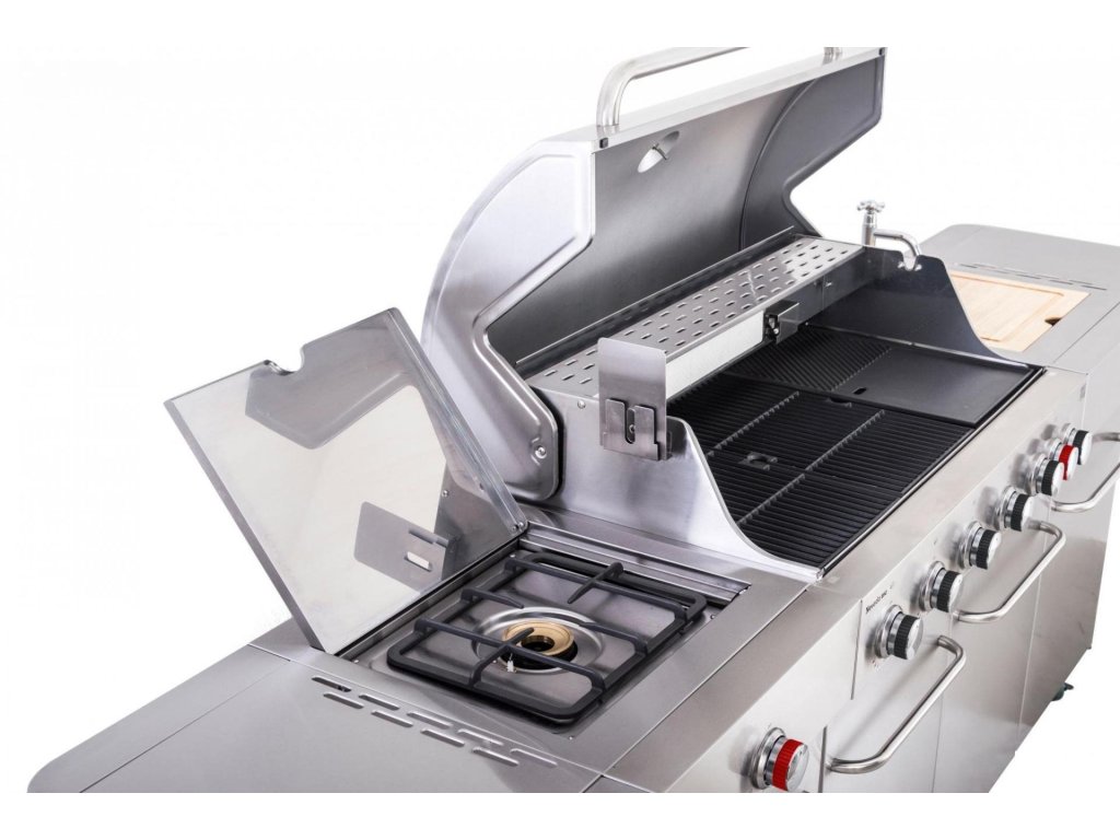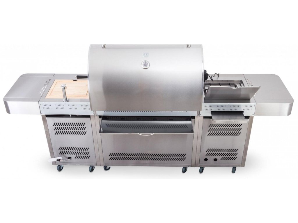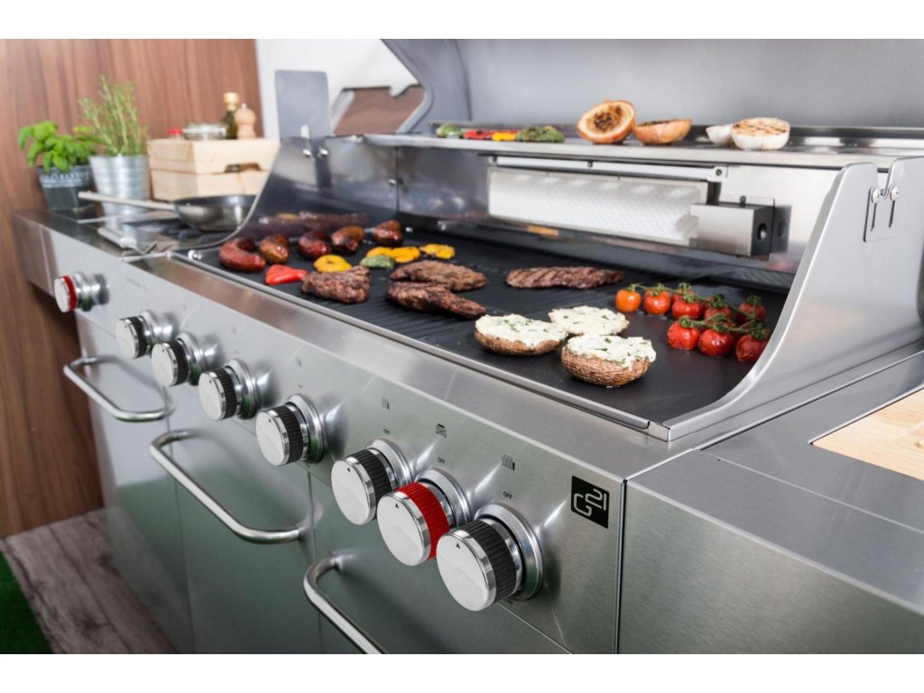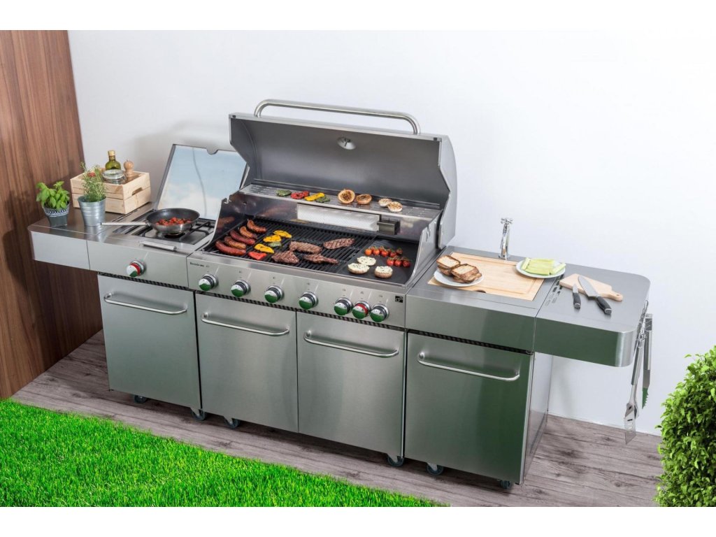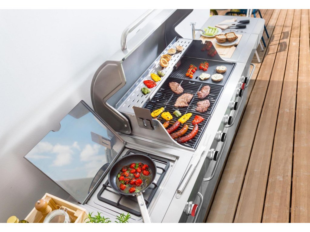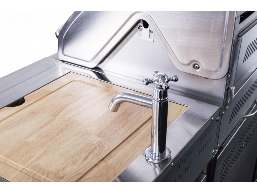 Vše na jednom místě – můžete zároveň grilovat, na bočním hořáku dusit přílohovou zeleninu a použité nádobí hned oplachovat ve vestavném dřezu, bez nutnosti přenášet grilovací vybavení neustále do domu a zpět.