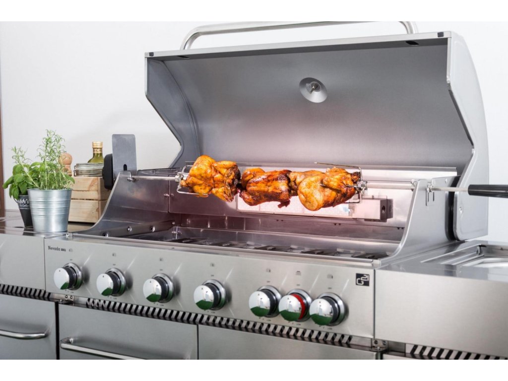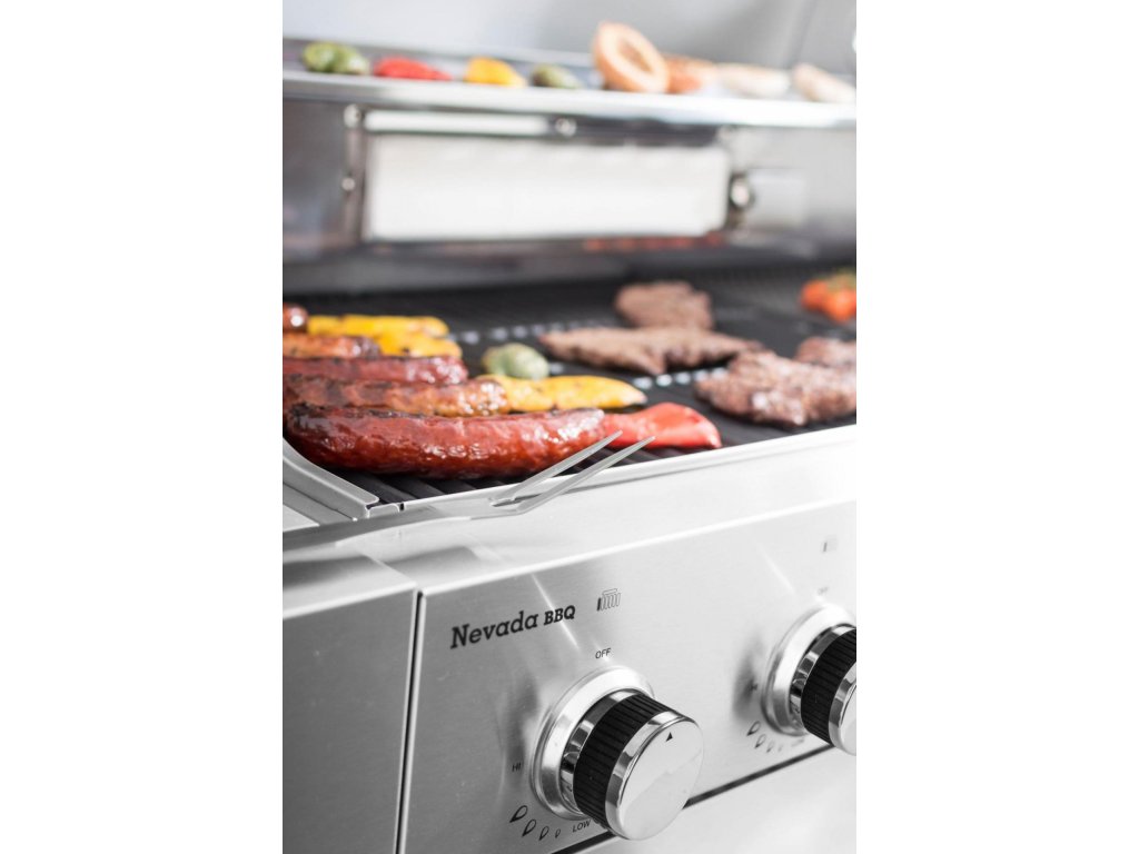 Plynový gril s 6 základními hořáky, 1 bočním + 1 Infra Red hořákem. Grilovací kuchyně Nevada má 8 hořáků, vestavěný dřez s víkem/krájecím prkénkem a velkou pracovní plochu, chytře řešené odkládací prostory, vestavěný teploměr ve víku, systém Flame Tamer a prodlouženou záruku.