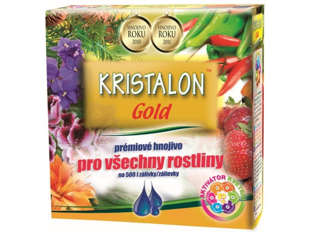 KRISTALON Gold – hnojivo nové generace je krystalické, vodorozpustné ES hnojivo s unikátním složením a aktivátorem kvetení. Udržuje rostliny stále v intenzívním růstu, zajišťuje lepší a zdravější kořenový systém i celkový stav rostlin, bohatší kvetení a více plodů. Kristalon Gold je univerzálně použitelný pro ovoce, zeleninu, všechny druhy pokojových i venkovních rostlin včetně ovocných stromů a keřů, vinnou révu. Zamezuje žloutnutí listů.
