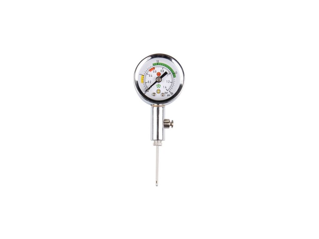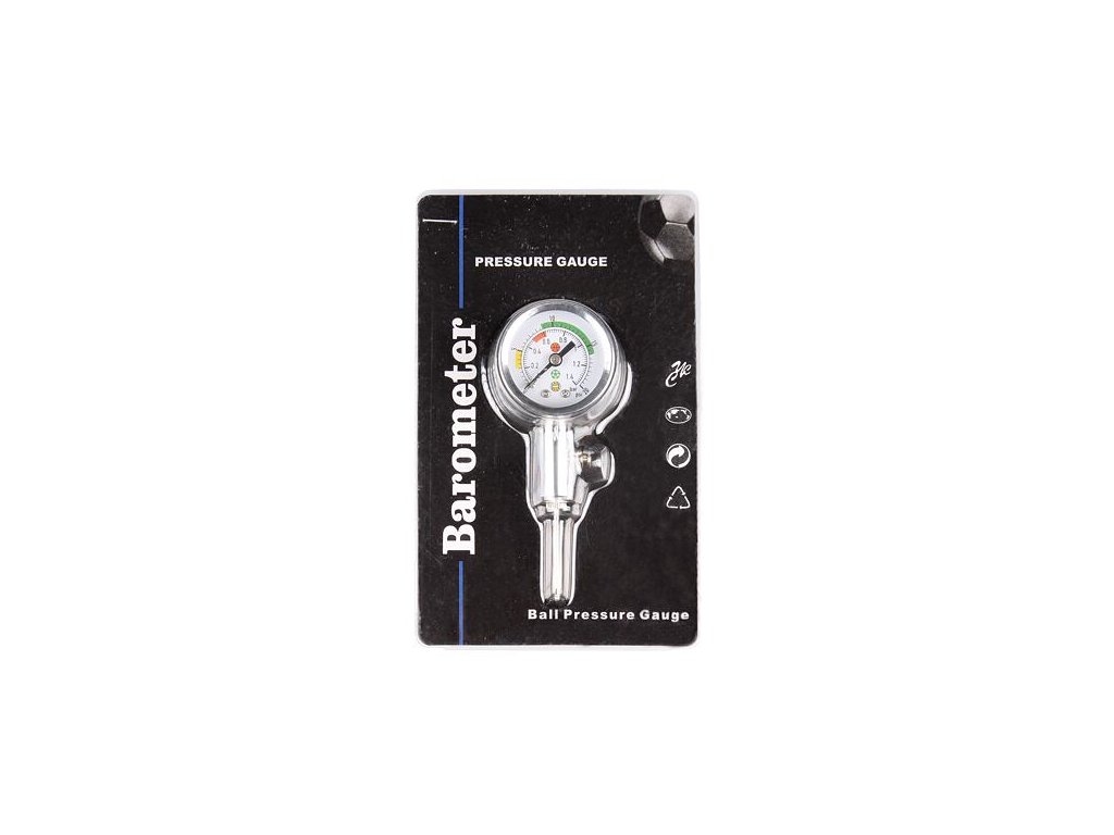Kovový tlakoměr s budíkem je praktická pomůcka, s jejíž pomocí snadno a rychle změříte tlak v jakémkoli typu sportovního míče. K tlakoměru pouze jednoduše našroubujete jehlu, která je součástí balení. Měřič tlaku míčů Pressure Ball má stupnici 0 - 1,4 bar a 0 - 20 psi. Na stupnici jsou barevně vyznačené doporučené hodnoty tlaku pro základní typy míčů (volejbal, basketbal, fotbal). Tlakoměr by měl patřit do základního vybavení každého sportovního klubu a každé školy. Upozornění: tlak v míčích kontrolujte vždy pouze s navlhčenou jehlou, aby nedošlo k poškození míče!
