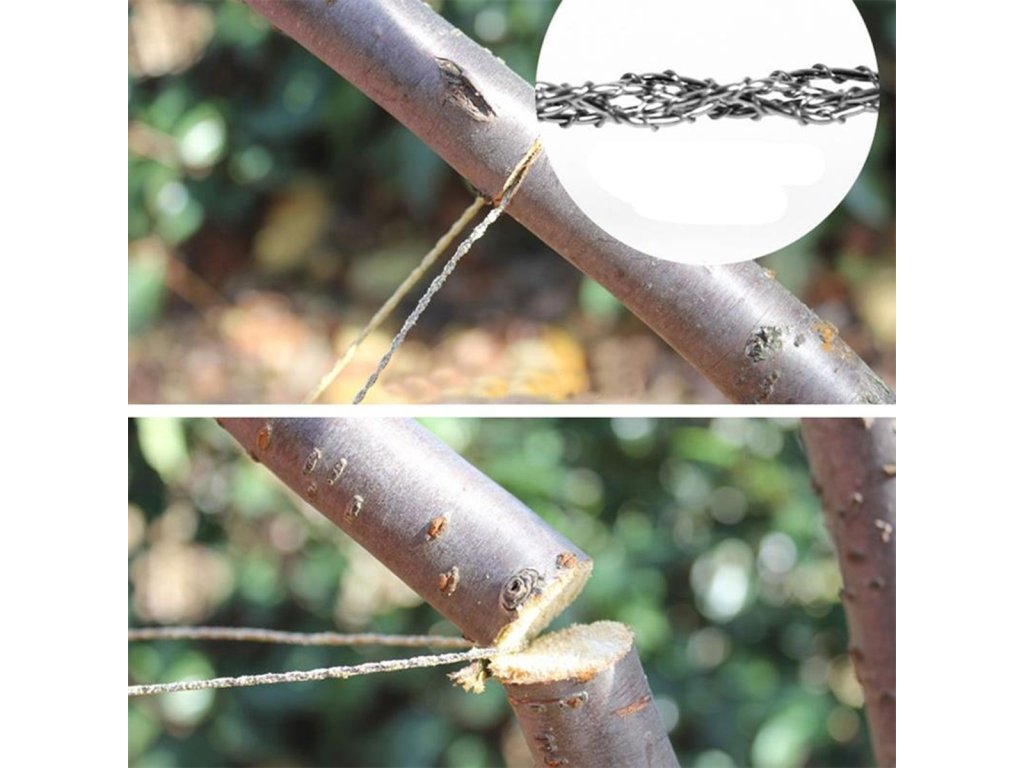 - Šňůra pily je velmi odolná díky použití vysoce tvrdé nerezové oceli. Jednoduchá a odolná konstrukce umožňuje řezat dřevo, plast, kov, led atd., ideální pro řezání na těžko dostupných místech, kde nelze použít větší pilu.