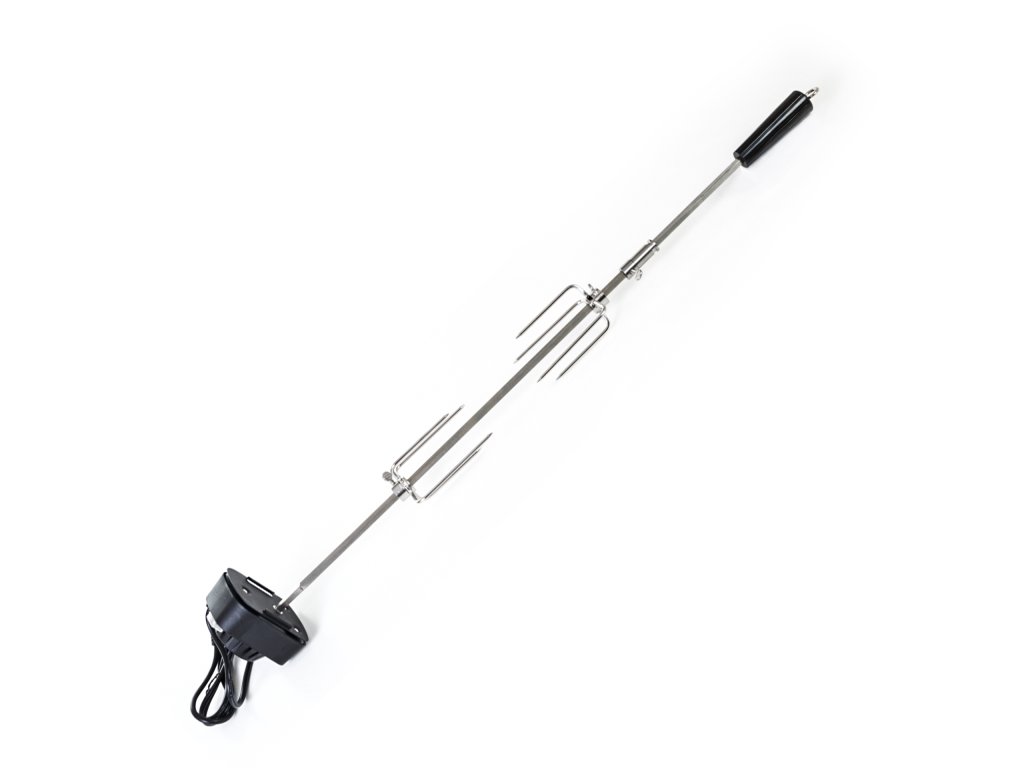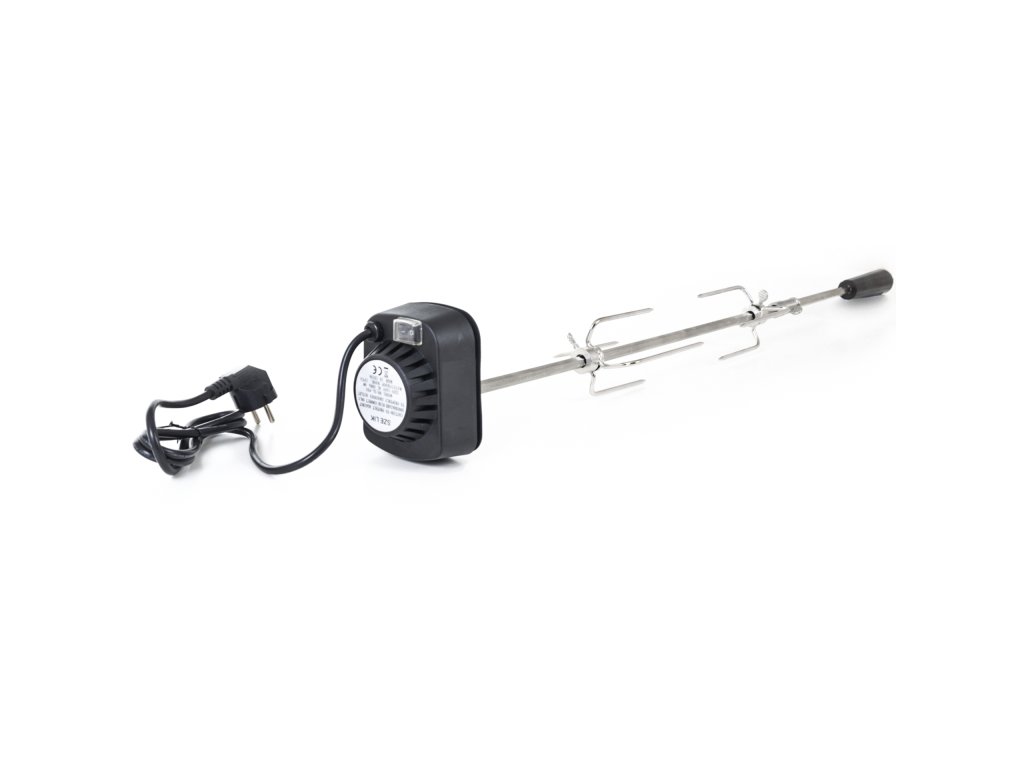 Z jedné strany je jehla opatřena odnímatelným plastovým držadlem, na kterém je praktické očko pro uchycení. Z druhé strany se nachází motorek v plastovém krytu, na kterém je umístěno tlačítko na zapínání / vypínání. Motorek s napětím 230 V jednoduše zapojíte do elektřiny pomocí kabelu v délce cca 125 cm. Motorek s jehlou otáčí rychlostí asi 2 otáčky za minutu, aby se připravovaný pokrm nepřipékal, ale pekl se rovnoměrně.