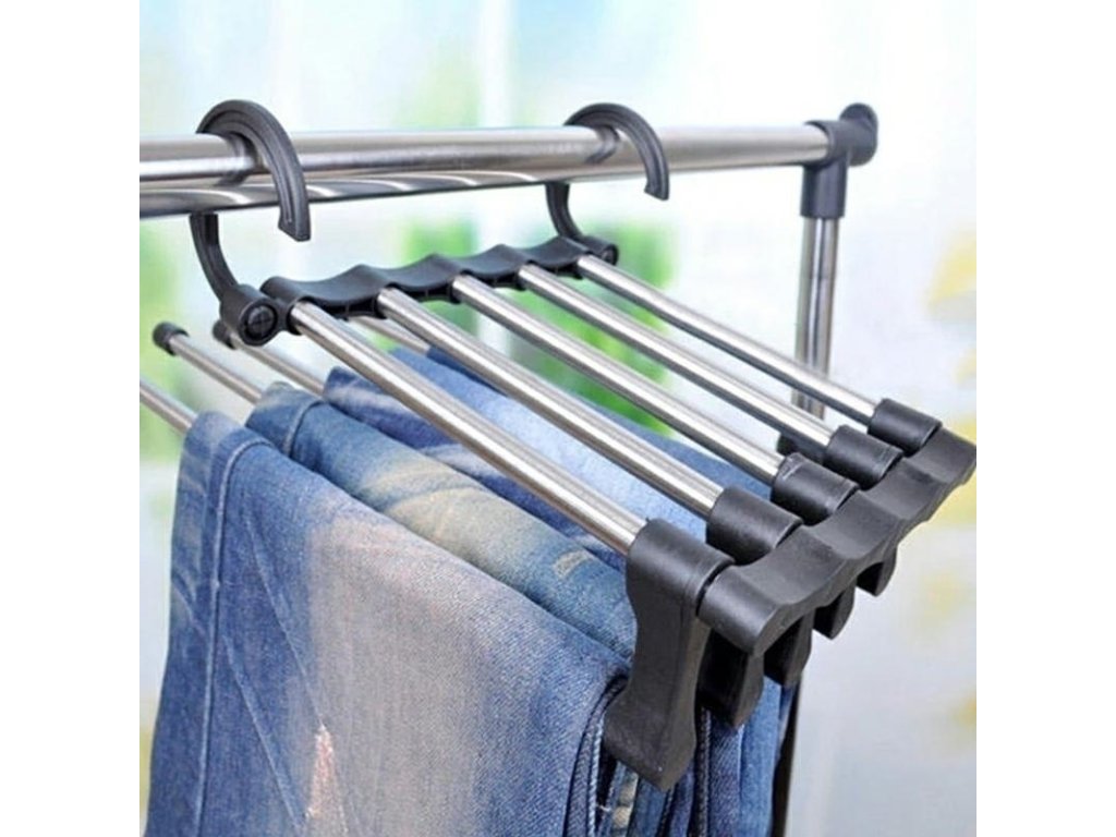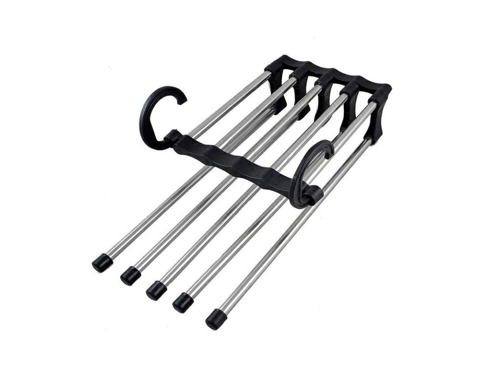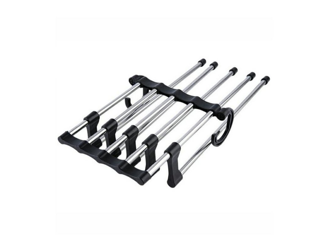 Ramínko na kalhoty s pěti výsuvnými rameny. Pomáhá udržovat pořádek ve skříni a šetří místo. Vyrobeno z vysoce kvalitní nerezové oceli a plastu.