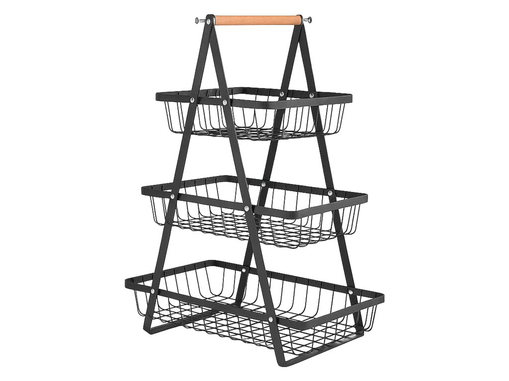 Tento třípatrový kovový regál s košíky je perfektním řešením pro uložení ovoce, zeleniny nebo drobných předmětů v kuchyni, koupelně nebo na balkoně. Jeho stabilní konstrukce ve tvaru A zajišťuje odolnost a estetický vzhled. Koše jsou prostorné a snadno přístupné, což usnadňuje organizaci. Je ideální pro domácnosti i komerční prostory. Rozměry: 32,5 x 18 x 48 cm