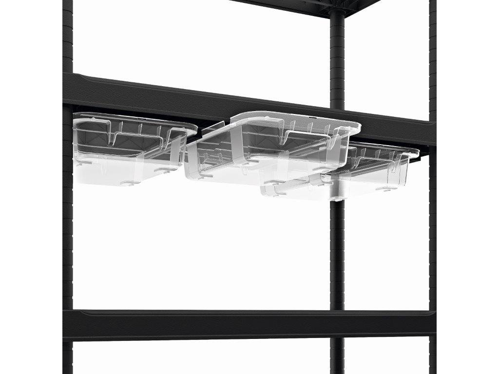 Zorganizujte si nářadí a pomůcky v garáži, ve sklepě nebo v jakékoliv jiné místnosti, kde chcete mít větší přehled o věcech. Regály Keter jsou promyšlené do nejmenších detailů. Díky chytrému systému můžete ukládat věci jak na police, tak využít pojezdy k zasunutí závěsných boxů a znásobit tak úložný prostor regálu. Mezi produkty s tímto chytrým systémem patří bezúdržbový regál Keter Plus Shelf Tribac/5 z pevného a odolného materiálu a každá z jeho polic unese až 60 kg, díky kterému se hodí do různých míst ve vaší domácnosti a převážně dílny. Na poličkách najdete mnoho místa pro vaše nářadí, věci na zahradu nebo třeba zásoby do kuchyně, například mouky a cukru. Zvýšené nožičky usnadní úklid pod regálem.