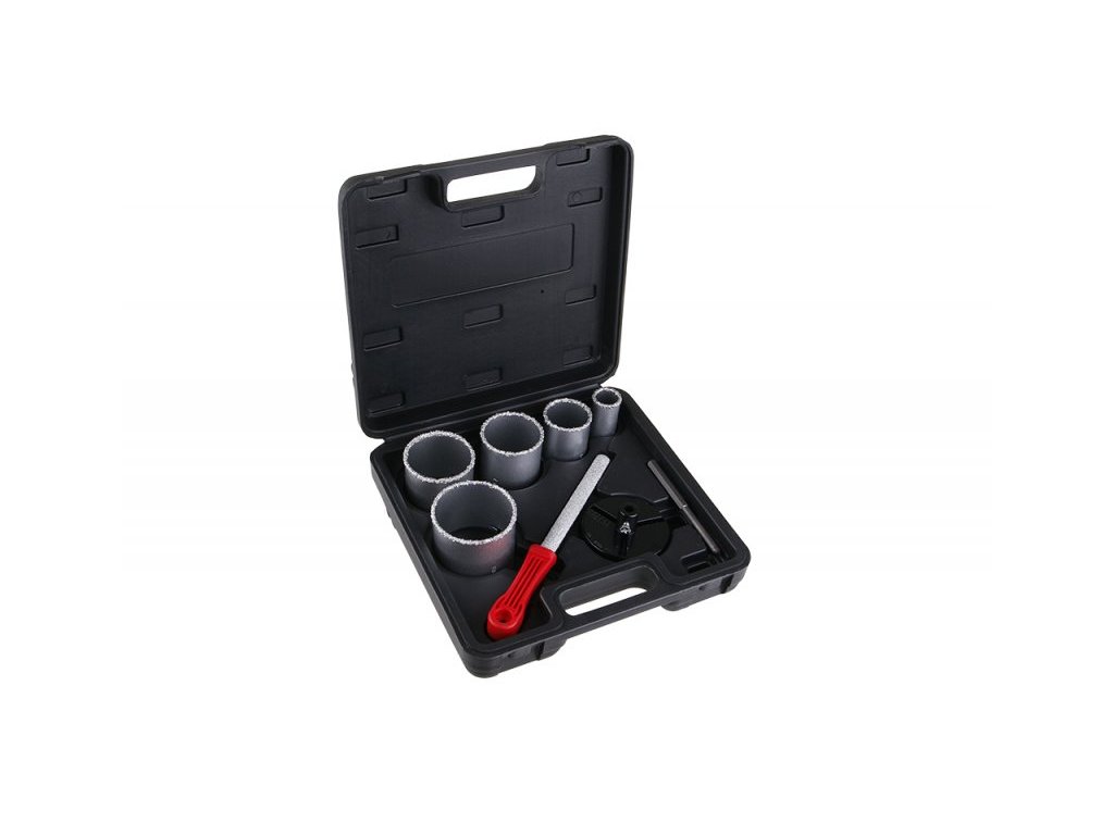 sada vykružovacích korunek s karbidovým ostřím pro čisté a přesné vrtání keramické dlažby a obkladů s pilníkem obsah sady - univerzální unašeč , speciální vodící vrták, korunky v průměrech 33, 53, 67, 73, 83 mm, pilník s karbidovým posypem