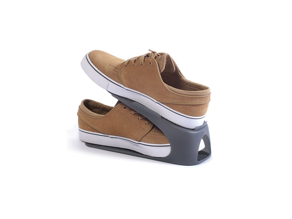 Plastový organizér na obuv. Vhodné pro obuv velikosti 38-45, rozměry: 10,5 x 14,5 x 27 cm, materiál plast, barva antracit, protiskluzový povrch, balení obsahuje 4 ks.