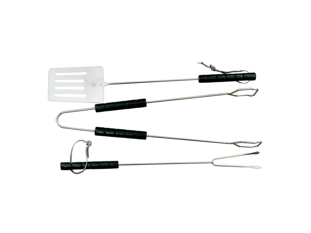Souprava nástrojů na grilování z chromované oceli, která zahrnuje kleště, vidličku a obracečku - příslušenství nezbytné pro pohodlné grilování.