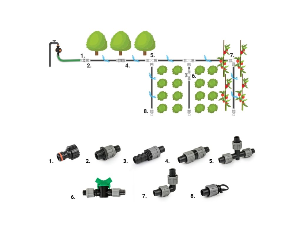 Sada spojek pro kapací a rozvodné hadice 16mm. Pevné spojení pomocí převlečných šroubení, snadná motnáž i demontáž.