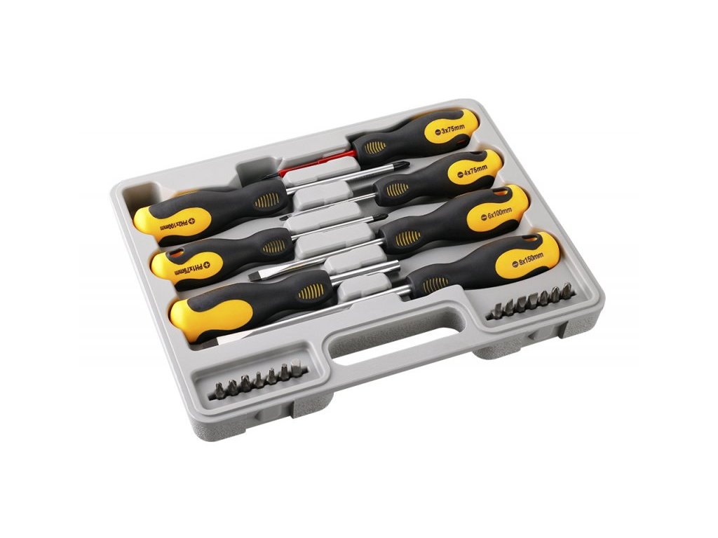 sada šroubováků a bitů 1/4" * 25 mm, CrV magnetické koncovky, ergonomická neklouzavá rukojeť obsah sady 21 kusů : 4x plochý šroubovák 4*75, 6*100, 8*150 a elektro 3*75 2x křížový šroubovák PH 1*75, 2*100 1x šroubovák na bity, 14x bit ploché 4, 5, 6, 7 - PH 1, 2, 3 - PZ 1, 2, 3 - Torx T 15, 20, 25 a adapter šestihran 1/4" / čtyřhran 1/4" plastové pouzdro