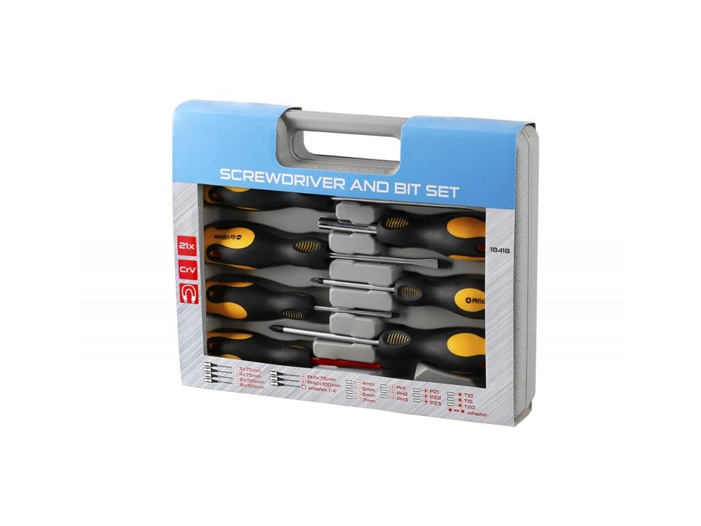 sada šroubováků a bitů 1/4" * 25 mm, CrV magnetické koncovky, ergonomická neklouzavá rukojeť obsah sady 21 kusů : 4x plochý šroubovák 4*75, 6*100, 8*150 a elektro 3*75 2x křížový šroubovák PH 1*75, 2*100 1x šroubovák na bity, 14x bit ploché 4, 5, 6, 7 - PH 1, 2, 3 - PZ 1, 2, 3 - Torx T 15, 20, 25 a adapter šestihran 1/4" / čtyřhran 1/4" plastové pouzdro