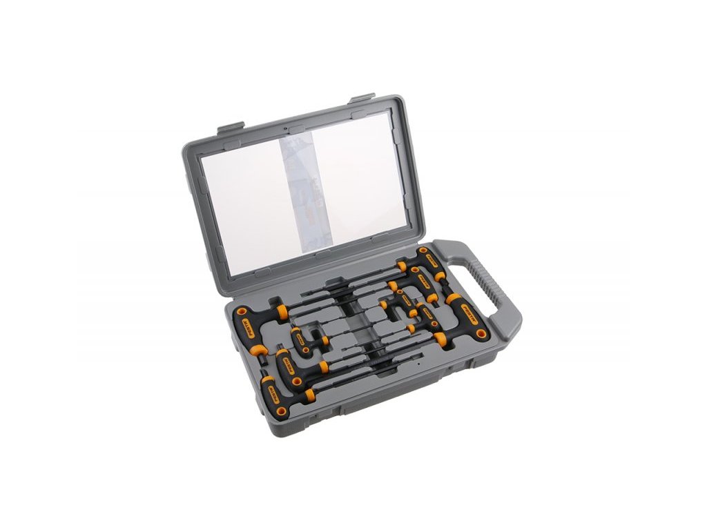 Sada nejpoužívanějších rozměrů L šetihranných klíčů FESTA (imbusů) s plast-pryžovou rukojetí včetně antiskluzového povrchu, CrV, tvrzených v celé délce, baleno v praktickém zavíracím kufříku s průhledem (šestihran 22,5345678 10).